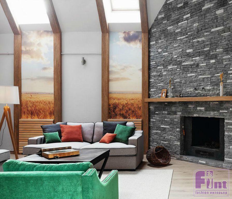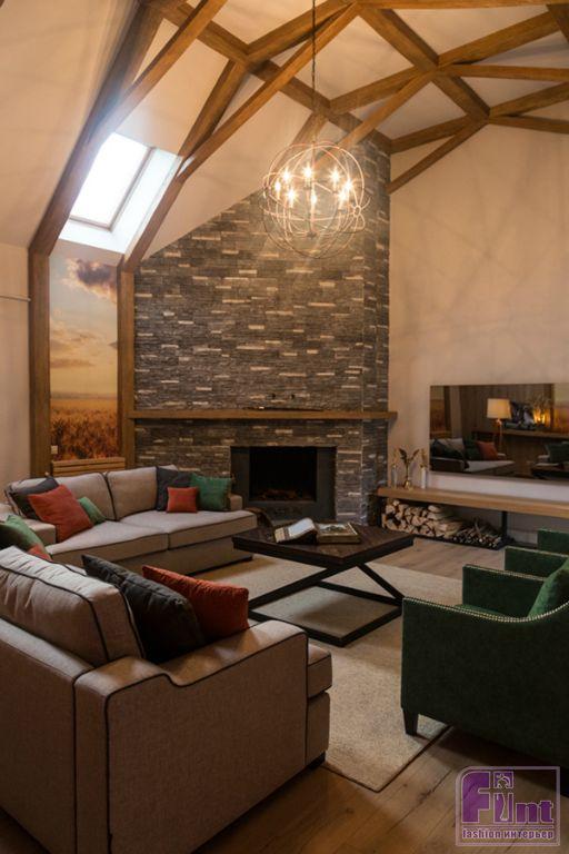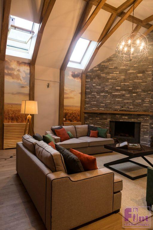 У этой мансардной комнаты сложная архитектура: окна, расположенные на значительной высоте от пола, в интерьере присутствует довольно массивный камин, а потолок со скошенными углами напоминает верх старинного деревенского амбарного сарая. Поэтому для визуального расширения пространства гостиной был создан новый оригинальный дизайн, который затем в кратчайшие сроки воплотили в жизнь.