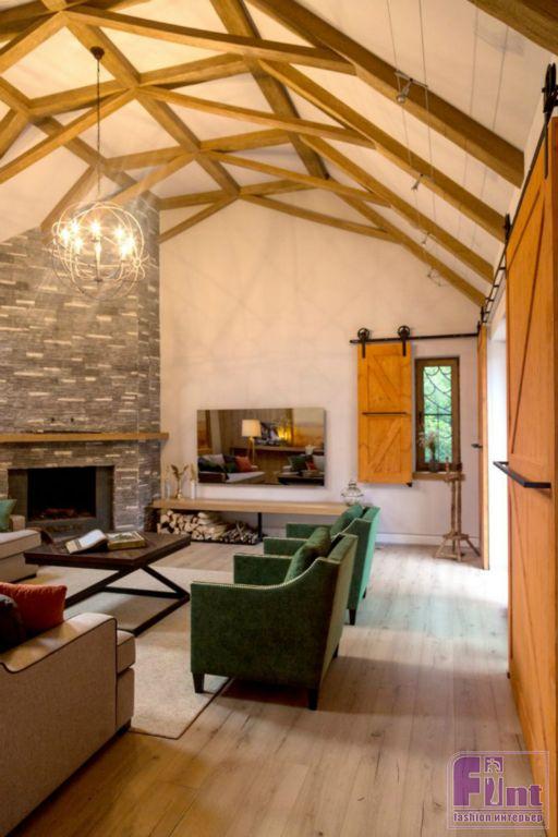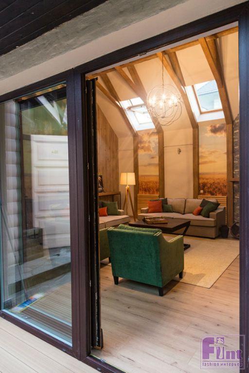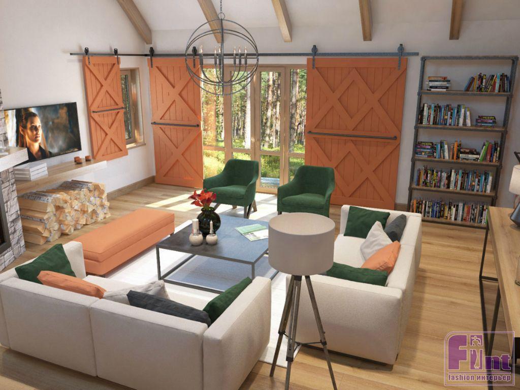 Непривычную геометрию потолка гостиной уравновесили и украсили балками под дерево. Яркая деталь – люстра из металлических чёрных прутьев, согнутых в многочисленные круги. Дополнительные источники искусственного света – светильники, подвешенные на струнах к потолку комнаты. Оригинальная задумка дизайнеров телевизионного проекта заключалась в декорировании в амбарном стиле панорамного дверного проёма и окон гостиной. Яркие полотна двери и окон снабжены роликами, на которых они сдвигаются в сторону по специально сконструированным направляющим контрастного чёрного цвета.