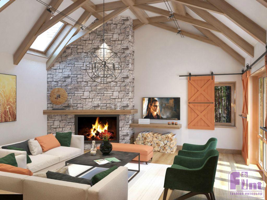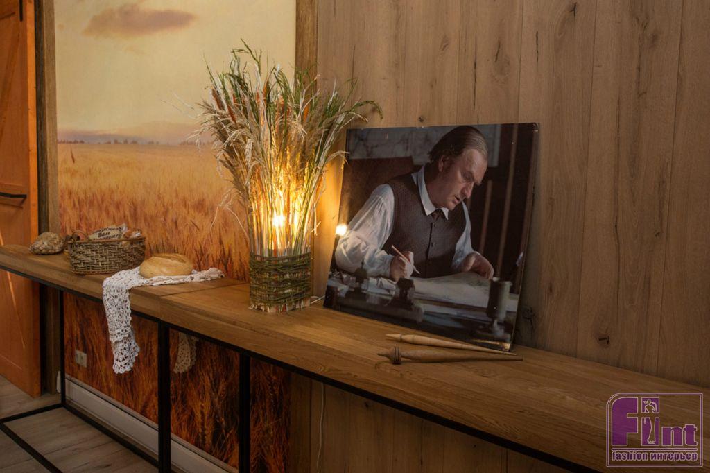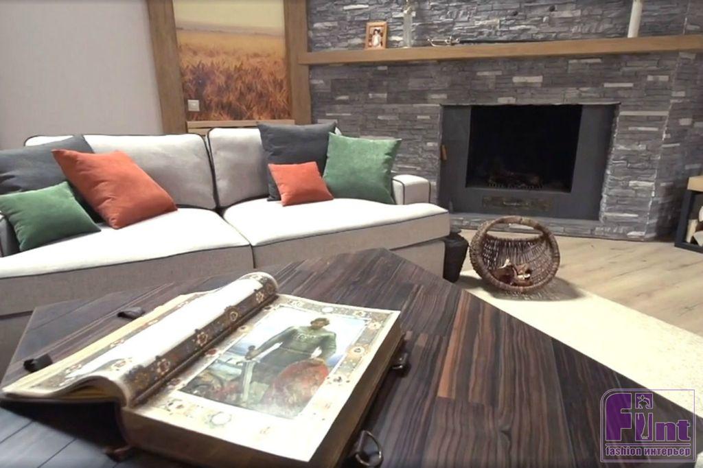 Каминный портал решено было облицевать особым колотым камнем. Пол вокруг огромного камина выстлан сланцем с шероховатой структурой. Справа от камина дизайнер поместил вытянутое горизонтальное зеркало и миниатюрную поленницу дров. Обновлённую гостиную актёра наполняют многочисленные занимательные вещи: портрет хозяина дома в образе литературного героя, берестяные лапоть и корзинка и декоративный каравай хлеба на ажурном полотенце.
