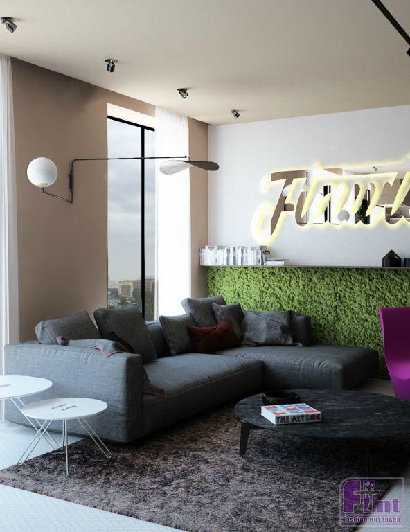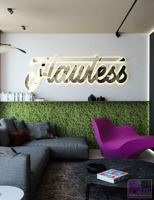 Очень необычное оформление интерьера дизайнер применил в гостиной. Здесь одна из стен оформлена при помощи эко декора из искусственного мха. Акцентную стену дизайнер разделил длинной горизонтальной полкой, протянувшейся от угла до угла, ниже которой стена выложена блоками с пышным искусственным мхом. Выше полки на чистой крашеной поверхности стены дизайнер поместил невероятную инсталляцию из зеркальных букв, складывающихся в английское слово «Безупречность».