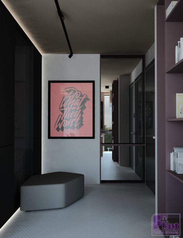 Одной из отличительных черт этого проекта стало наличие ярких и необычных постеров, которыми дизайнер украсил стены практически во всех помещениях квартиры. Не стал исключением и небольшой коридор. На небольшом участке стены, рядом со встроенным шкафом с зеркальными дверями, Никита предложил повесить яркий постер в неожиданной розово-чёрной цветовой гамме. Этот сочный цветовой акцент отлично дополняет сдержанную динамику интерьера входной зоны квартиры-студии.