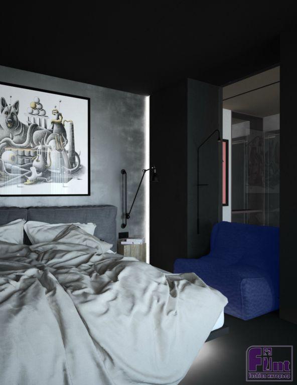 В этом интерьере особенно стоит отметить необычное решение по напольному покрытию: все полы выложены мозаикой. Спальня со всех сторон отрезается от пола и стен подсветками, благодаря чему создаётся ощущение, что кровать словно парит над полом. Потолок не выкрашен в традиционный белый цвет. Все эти параметры делают проект очень оригинальным и запоминающимся.