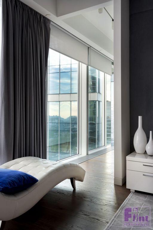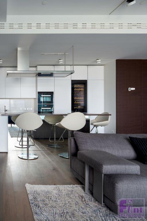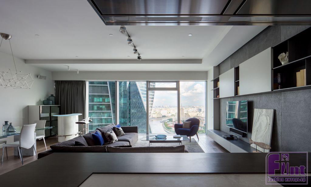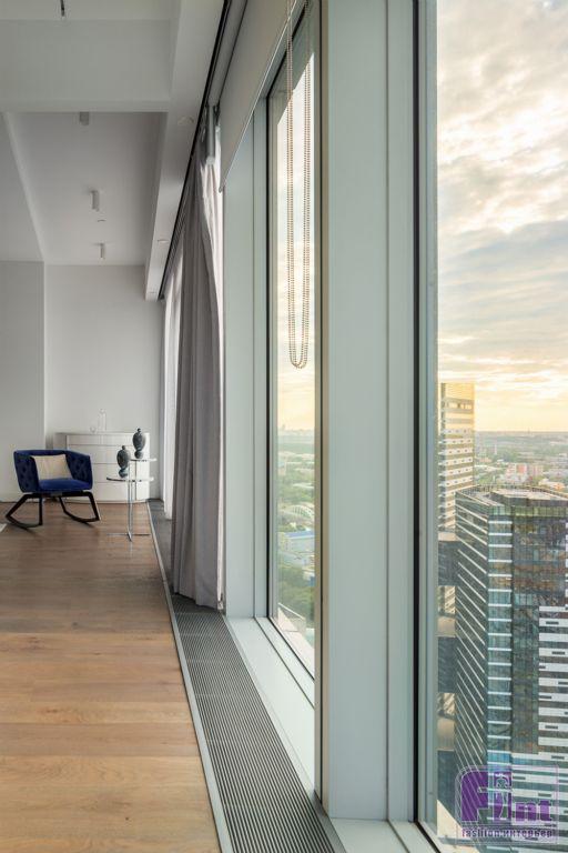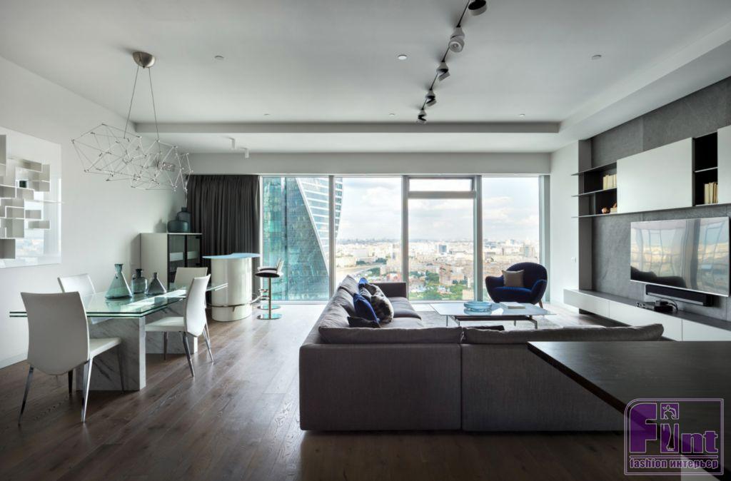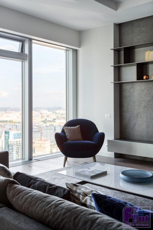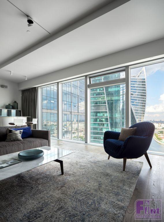 Интерьеры апартаментов выполнены в современном стиле с преобладанием прямых вертикальных и горизонтальных линий. Часть мебели сохранена и вписана в новые интерьеры по пожеланию заказчиков. Особенностью квартиры является панорамное остекление фасадов с видом на Москву, именно эта особенность учитывалась при проектировании пространства, планировочных решений и расстановки мебели.