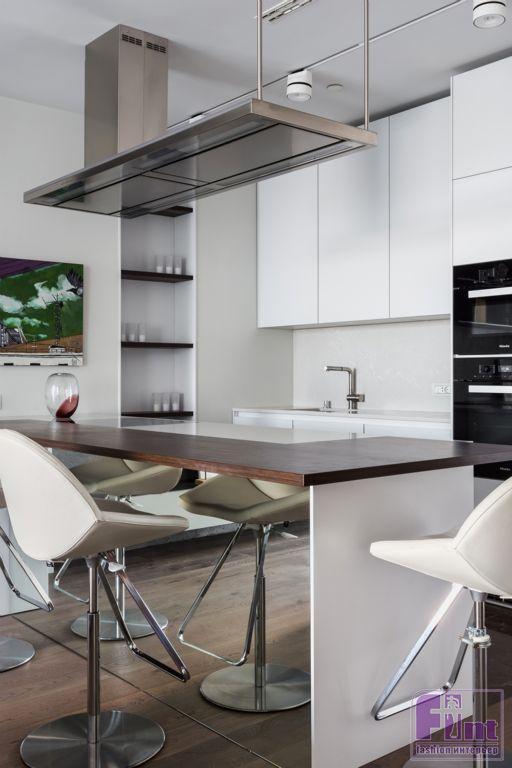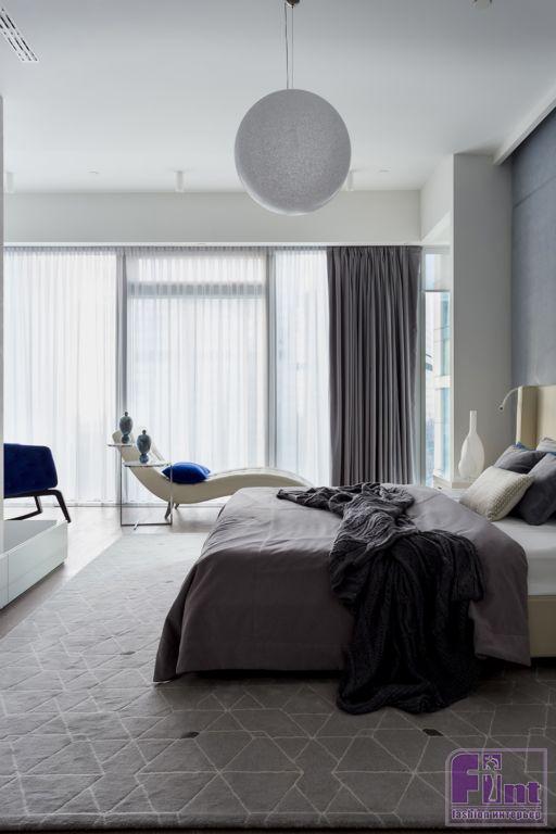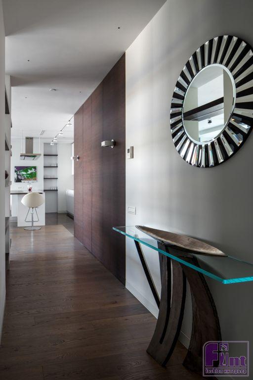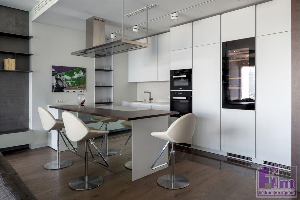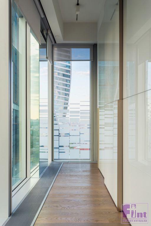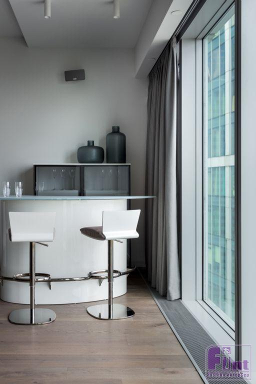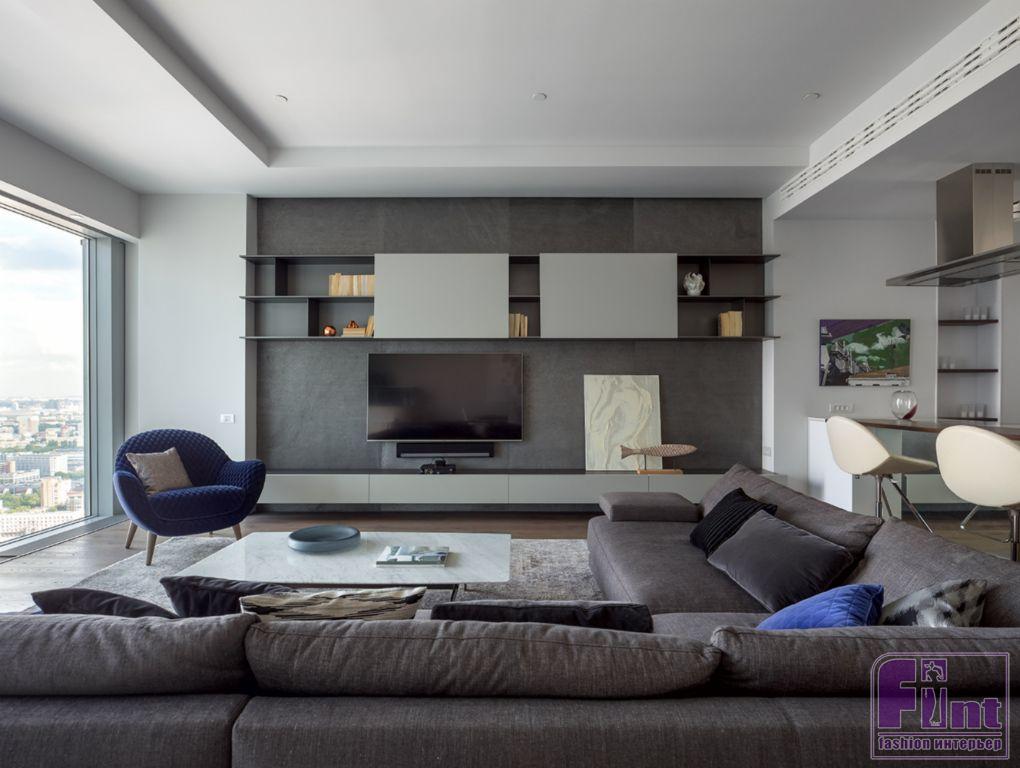 Интерьеры апартаментов выполнены в современном стиле с преобладанием прямых вертикальных и горизонтальных линий. Часть мебели сохранена и вписана в новые интерьеры по пожеланию заказчиков. Особенностью квартиры является панорамное остекление фасадов с видом на Москву, именно эта особенность учитывалась при проектировании пространства, планировочных решений и расстановки мебели.