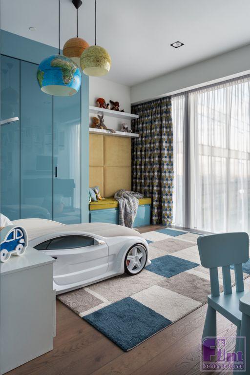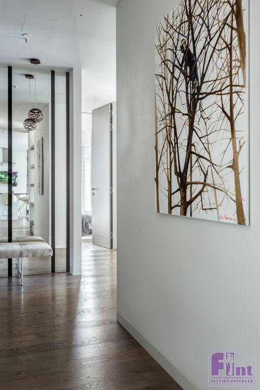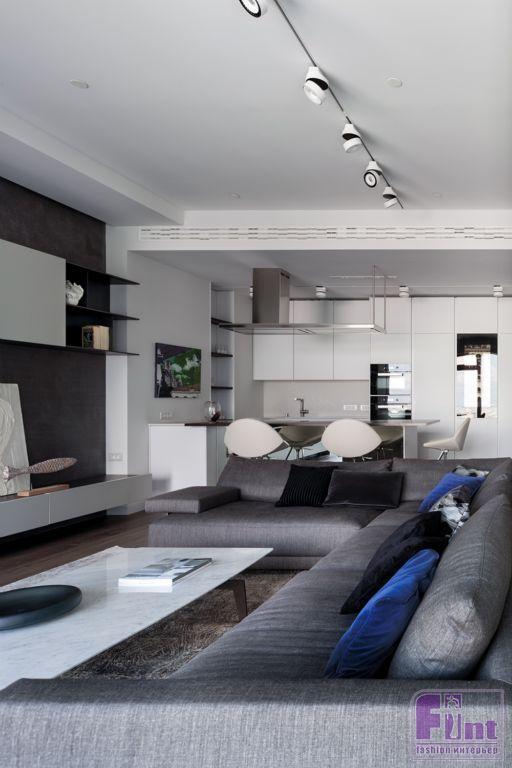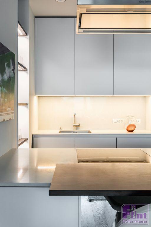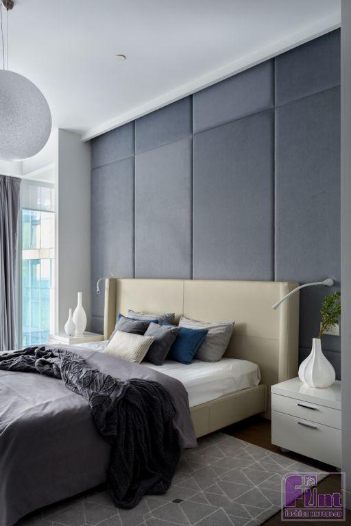 В результате полной перепланировки гостевые зоны и спальни поменялись местами. Также в квартире появился кабинет, детская и постирочная. Основными оттенками интерьера стали спокойные светлые тона с преобладающим серым (за исключением детской). Мебель подбирали с прямыми строгими линиями. Отдельные предметы были выполнены на заказ по эскизам студии, например, светильники в детской комнате. Текстиль, декор и картины дизайнер подбирал с особой тщательностью на различных онлайн площадках.