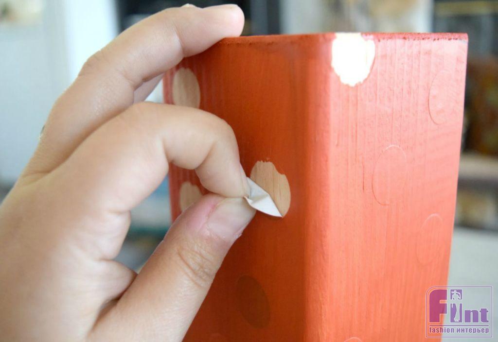 Перед окрашиванием нам необходимо создать на заготовках трафаретный орнамент, для чего мы будем использовать круглые наклейки, создающие орнамент «горошек» и обычный малярный скотч. Приклейте круглые наклейки в шахматном порядке на самую длинную заготовку, среднюю оформите спиральным орнаментом, а самой маленькой достанется орнамент «полоски». Приклеивайте круглые наклейки и малярный скотч, тщательно приглаживая их, чтобы исключить сильного подтекания краски под разметку.