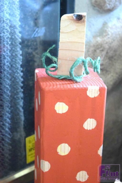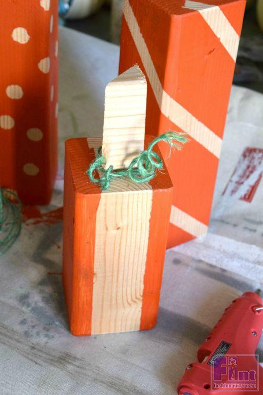 Для придания большего сходства с натуральными тыквами нам необходимо приделать к каждой нашей заготовке «хвостик» Для этого отлично подойдут деревянные бруски треугольного сечения. Приклейте их при помощи клеевого пистолета по центру верхних граней или используйте клей для древесины (в этом случае нужно дождаться высыхания клея, прежде чем продолжать декорирование).