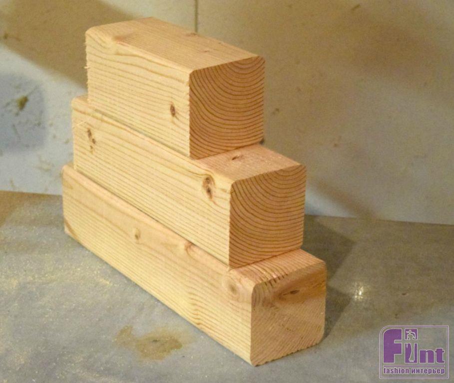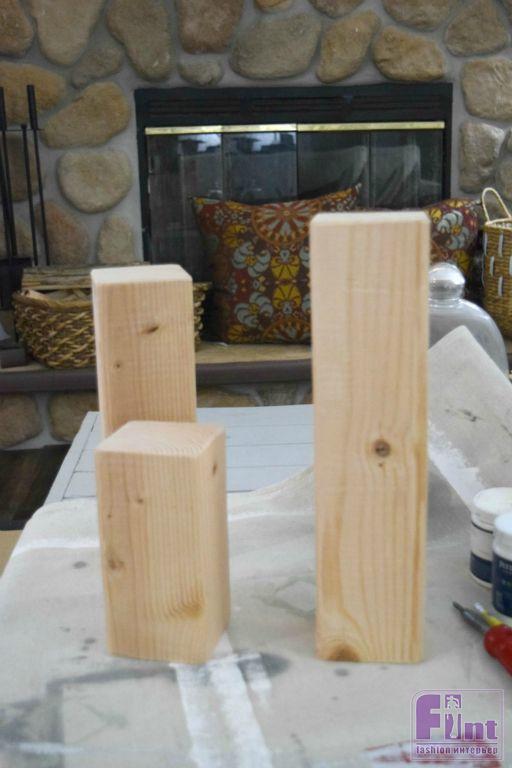 Как видите, чтобы создать эти удивительные аксессуары для стильного осеннего интерьера, вам не нужно много материалов и инструментов. Если у вас имеется целый деревянный брусок, разрежьте его по размерам 20, 25 и 30 см. Такой «шахматный» шаг размеров обеспечивает красивую визуализацию группы из трёх предметов. После распила, отшлифуйте края заготовок так, чтобы немного закруглить острые грани.