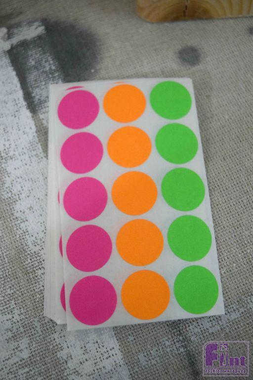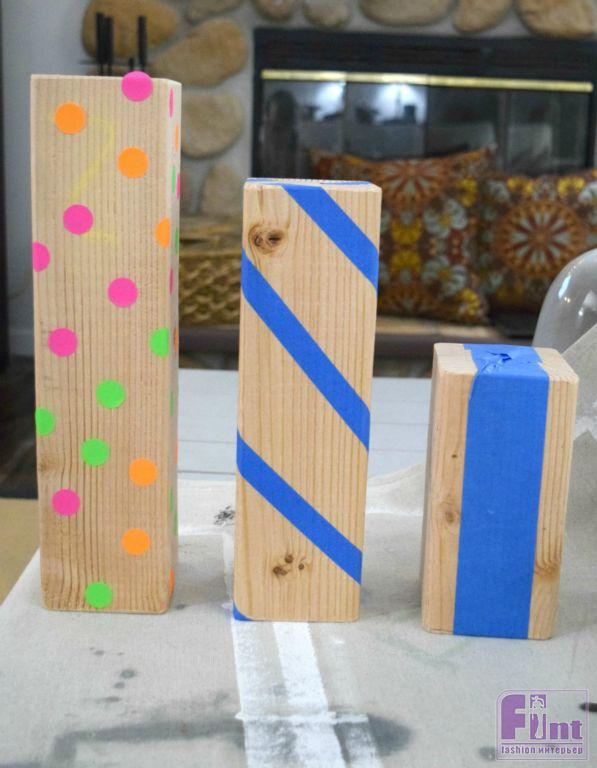 Перед окрашиванием нам необходимо создать на заготовках трафаретный орнамент, для чего мы будем использовать круглые наклейки, создающие орнамент «горошек» и обычный малярный скотч. Приклейте круглые наклейки в шахматном порядке на самую длинную заготовку, среднюю оформите спиральным орнаментом, а самой маленькой достанется орнамент «полоски». Приклеивайте круглые наклейки и малярный скотч, тщательно приглаживая их, чтобы исключить сильного подтекания краски под разметку.
