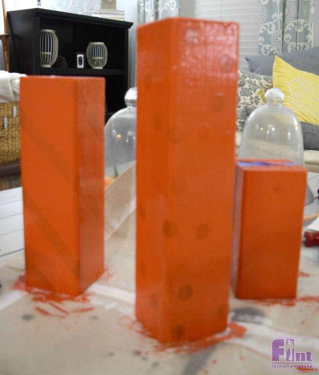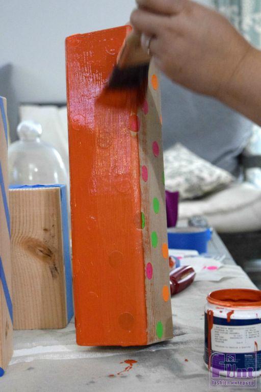 После того, как все три заготовки были оформлены так, как мы планировали, пришло время рисовать! Чтобы наши брусочки стали похожими на тыквы мы выбрали яркую оранжевую краску на водной основе. Наносить краску лучше вертикальными движениями кисти, двигаясь вдоль волокон древесины.