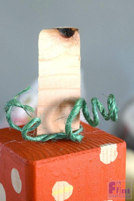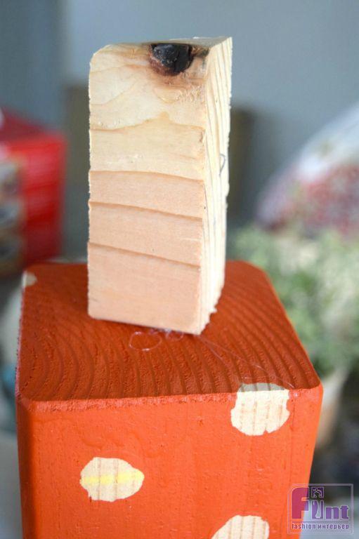Для придания большего сходства с натуральными тыквами нам необходимо приделать к каждой нашей заготовке «хвостик» Для этого отлично подойдут деревянные бруски треугольного сечения. Приклейте их при помощи клеевого пистолета по центру верхних граней или используйте клей для древесины (в этом случае нужно дождаться высыхания клея, прежде чем продолжать декорирование).