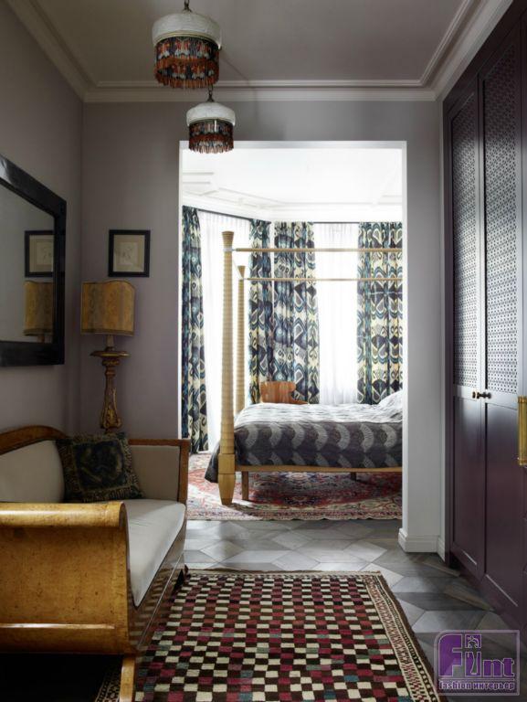 В спальне супругов и в комнате старшей дочери установлена мебель из карельской березы. На полу — сделанный под заказ дубовый паркет с очень оригинальной ромбовидной укладкой. Благодаря большим окнам, территория для сна и отдыха наполнена светом. В интерьере спальни выделяется кровать с резными колоннами и текстильным изголовьем в этническом стиле. Стены увешаны семейными портретами.