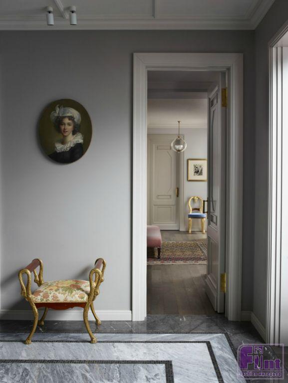 Александра Вертинская отказалась от модного белого цвета в интерьере. Она использовала сложные серо-розовые, серо-лавандовые оттенки и графит. Все стены декорированы экологически чистыми красками на водной основе. Тщательно подобранный голубой тон  краски для стен гостиной удивительным образом способен менять свой оттенок, в зависимости от освещения: при искусственном освещении голубой цвет стен приобретает сиреневые и розовые оттенки.