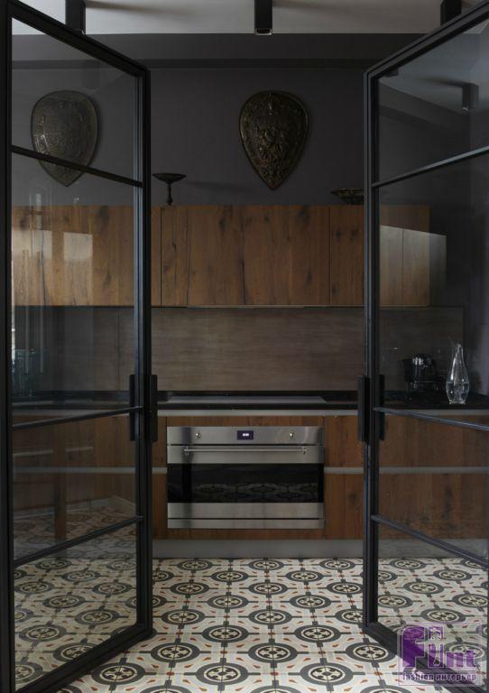 На просторной территории тёплой кухни декорированной в стиле минимализма господствуют серо-коричневые цвета. Пол покрыт знаменитой орнаментальной метлахской плиткой, славящейся своей невероятной долговечностью и прочностью.