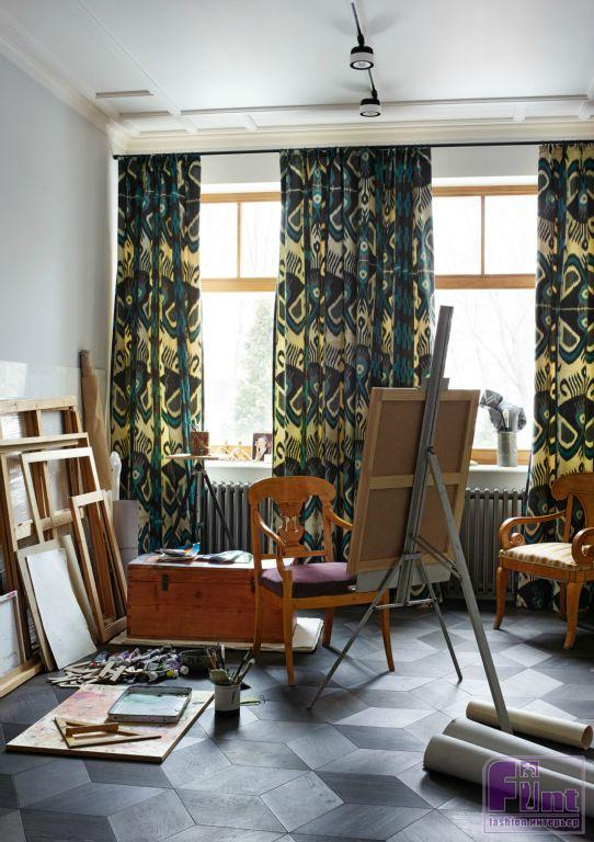 Итальянская винтажная люстра, мраморно-латунный чайный столик в стиле 50-х годов и антикварная оттоманка прекрасно дополняют атмосферу комнаты. На потолке — лепнина с геометрическим узором. Шторы, изготовлены в Узбекистане с вручную созданным восточным орнаментом «икат», сотканным из шёлковых нитей. Они привнесли в обстановку колорит азиатского солнца и стали отличным ярким акцентом помещения.