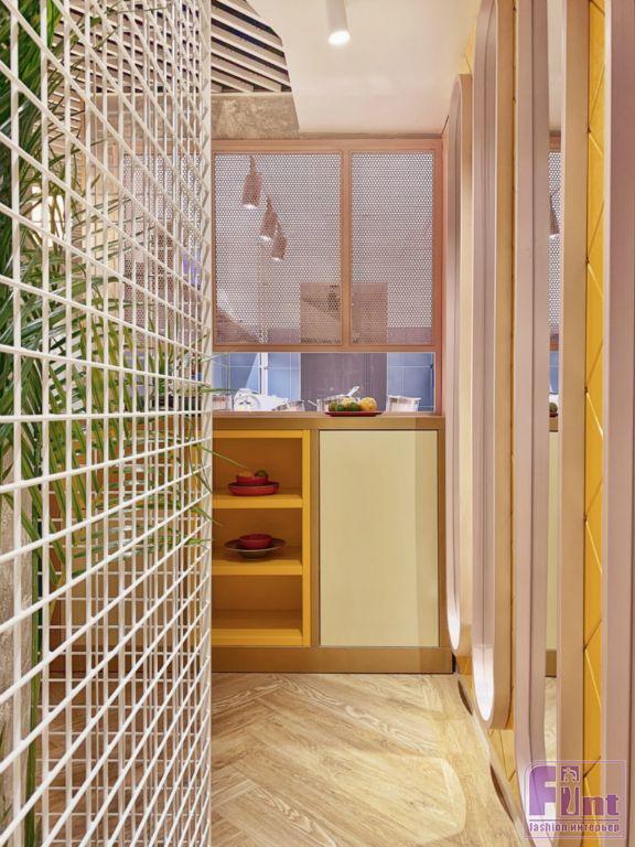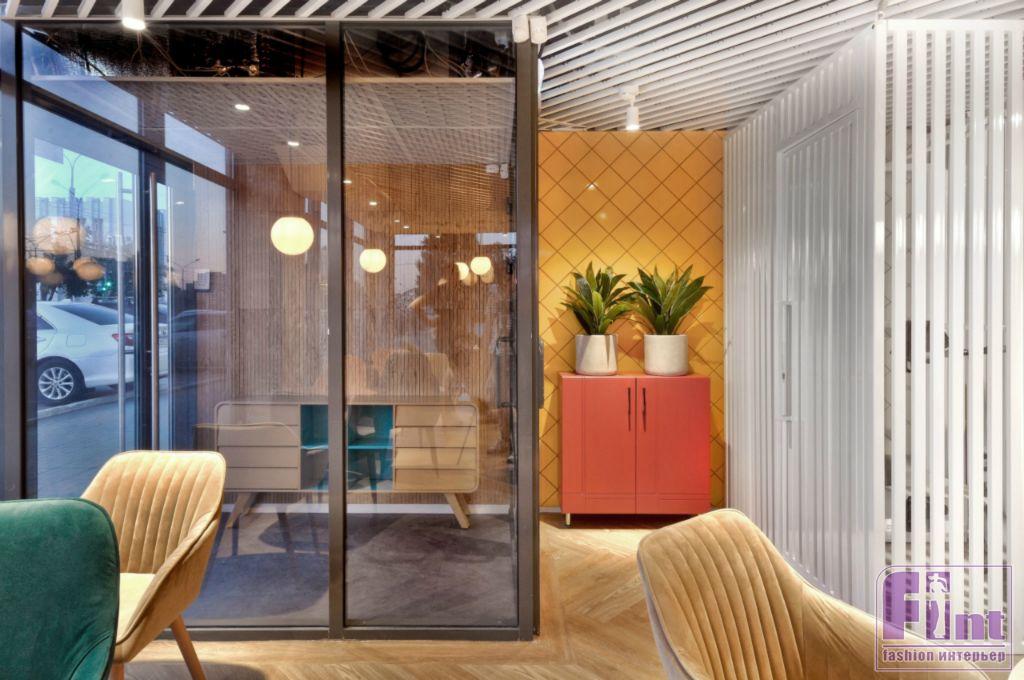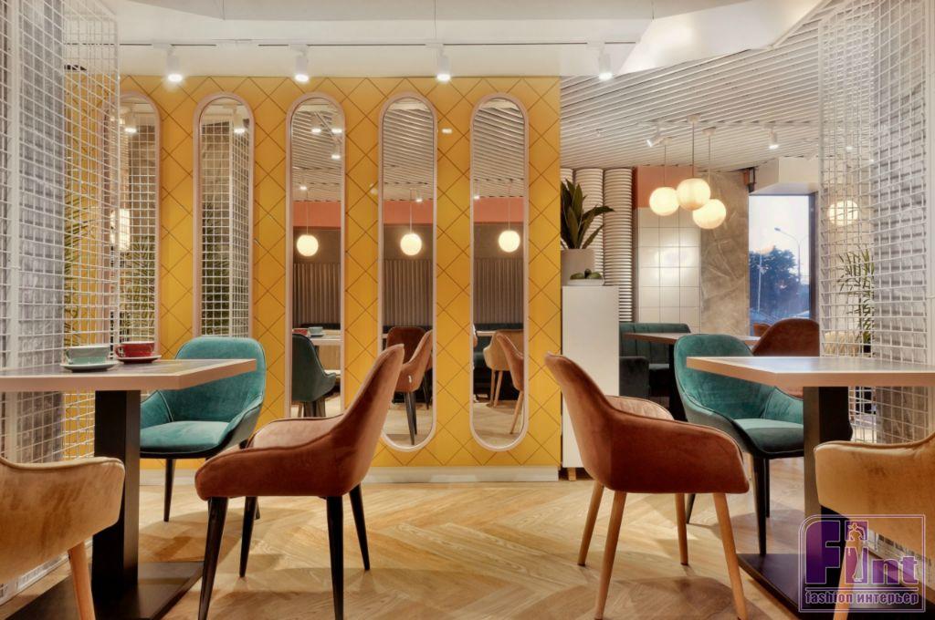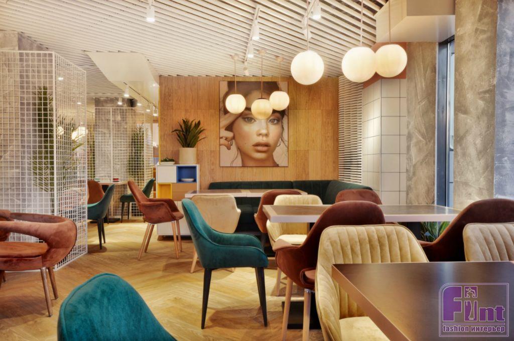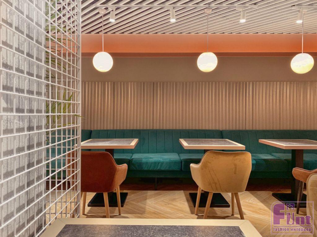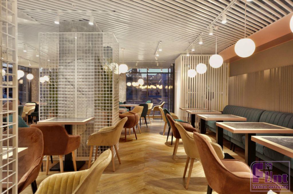 В новом пространстве кафе, по замыслу Артемия, появился открытый бар, а так же полузакрытая кухня. По проекту предусмотрена одинаковая посадка гостей кафе, что не требовало разработки разных посадочных сценариев. Изначально в помещении были довольно низкие потолки, а с учётом того, что под потолком требовалось протянуть новые сети (электричество, вентиляция и пр.) и коммуникации, потолок мог бы опуститься до критических показателей. Но Артемию удалось весьма виртуозно обойти эту проблему. Он разработал реечный подвесной потолок, который минимально скрадывает драгоценные сантиметры высоты помещения и сохраняет технический доступ ко всем сетям, расположенным за этим декоративным потолком. Диагональная и ритмичная схема расположения брусков в потолке также помогает его визуально «приподнять» и добавить в интерьер «воздуха».