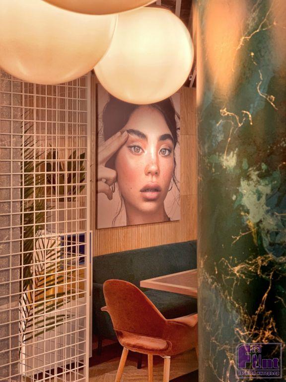 Вся посадка зала – мягкая, безподиумная, от лонг софы, до полукресел, изготовленных специально для проекта. Барная стойка выполнена из цельных листов металла. Яркие дизайнерские комоды были сделаны на заказ по эскизам и схемам дизайнера. Интересно выглядят столы, столешницы которых собраны из камня, розового металла, МДФ, и дополнены чёрным подстольем и изображениями сильно увеличенных птичьих образов. Эти необычные столы не только прекрасно вписались в интерьер кафе, но и выступают в роли отличных фонов для ярких и сочных фотографий еды для instagram, что уже по достоинству оценили посетители кафе.