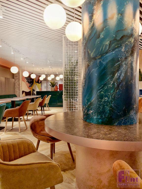 Специально для этого релиза Артемий разработал несколько инновационных видов покрытий, таких как деревянная плитка и глубокая плитка из МДФ. Изящную круглую колонну задекорировали ручной росписью с детальной проработкой трещин синего минерала, перекликающегося с фирменным цветом логотипа кафе «Ранние пташки». Также были придуманы и изготовлены кашпо для растений, ставшие отличным аксессуарным дополнением к интерьеру. Артемий не обошёл своим вниманием ни одной зоны из пространства кафе, добавив яркого дизайна даже в гостевой санузел со стильным умывальником, отлитым из бетона. Весь интерьер кафе получился очень светлым, по-домашнему пастельным и нежным, как раннее утро, атмосферу которого можно явственно почувствовать при посещении этого нового пермского кафе.