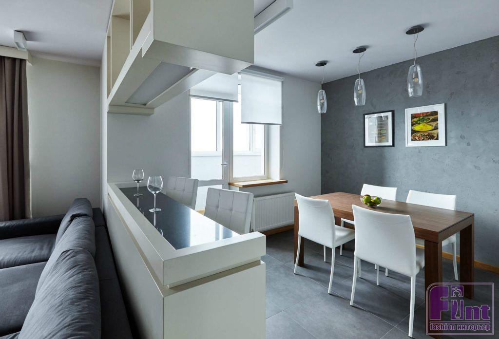 Гостевая зона имеет характерную для современных интерьеров студийную планировку. Гостиная, кухня и столовая составляют единый объём, зонированный барной стойкой и несущей колонной. Особое внимание было уделено цветовой палитре. В гостиной доминирует белый, эффектно контрастирующий с темно-шоколадной стеной. Одна из стен кухни-столовой окрашена декоративной штукатуркой под бетон, оттеняющей дубовый пол.