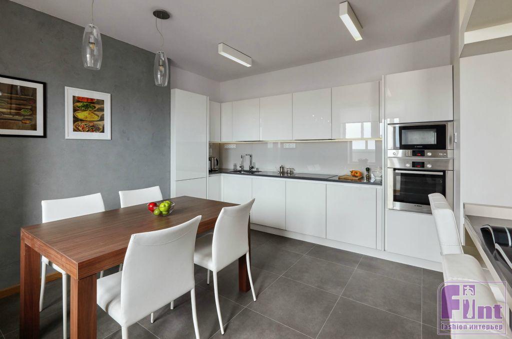 Оригинальный кухонный гарнитур без видимых ручек исполнен с применением белых глянцевых фасадов в нижней части, для верхней же части применена древесина каштана. Интерьер детской исполнен с применением ярких цветовых акцентов. В детской комнате дизайнер использовал не только цветовые акценты, но и предусмотрел стильную акцентную стену, которая была декорирована фотообоями с графичным рисунком. Эти экологически чистые фотообои были сделаны на заказ специально для данного проекта.