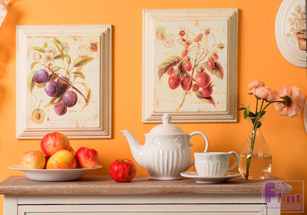 Гармоничное сочетание небольших картин в рамах с изображением чашки чая, столовых приборов или кофеварки, сочных экзотических фруктов и ягод добавит изысканности и аутентичности вашей кухне.