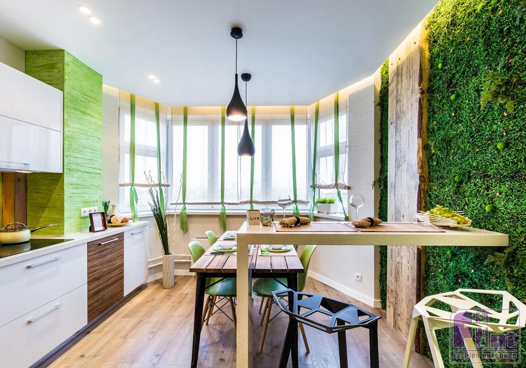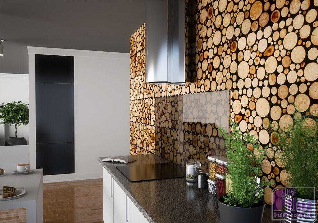Если вы любитель натуральных материалов для отделки и декорации, вы можете сочетать декорацию из деревянных панелей с яркими зелёными растениями. Особенно стильно и современно смотрятся не простые панели, а цилиндрические спилы стволов.