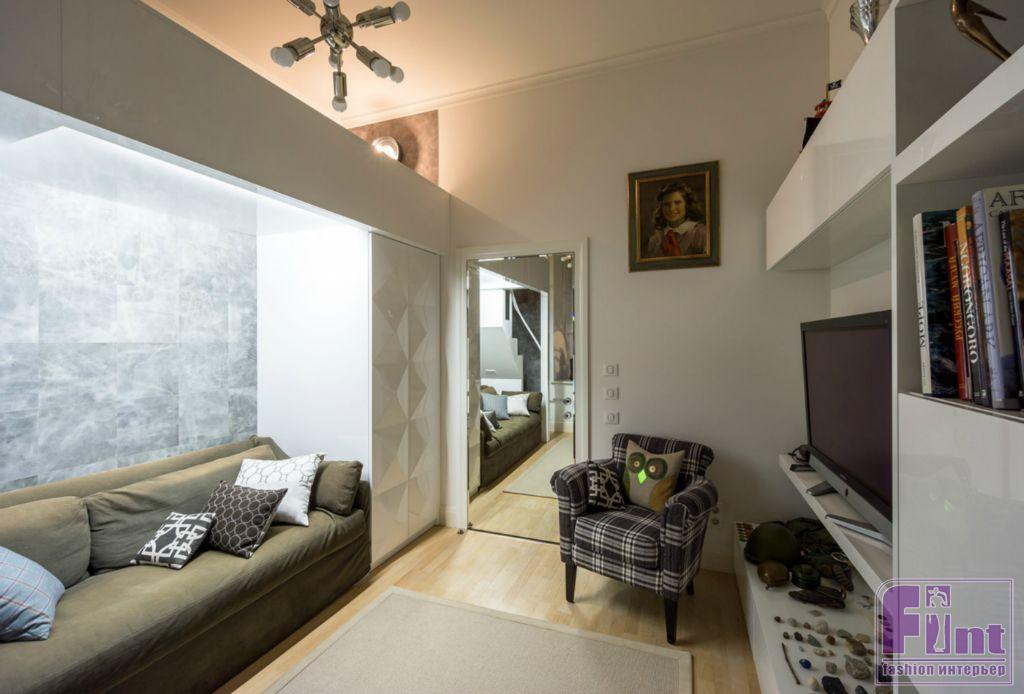 Чтобы не нарушать экологичность обстановки, всю бытовую технику Татьяна Горшкова спрятала в шкафах и колонках. Встроенные светильники повышают функциональность помещения и создают особое настроение. Через небольшой коридор можно попасть в приватные помещения – спальню и детскую комнату. Также здесь расположены гардеробная и две ванные комнаты.