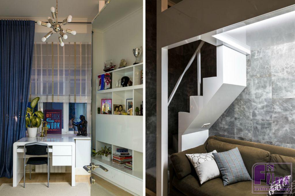 Интересный приём дизайнер нашла для оформления детской, увеличив пространство с помощью зеркальной двери. Потолки в доме довольно высокие, поэтому появилась возможность оборудовать антресоль. Плитка жемчужного цвета из кожи добавляет оборудованному на антресоли помещению уюта и элегантности.