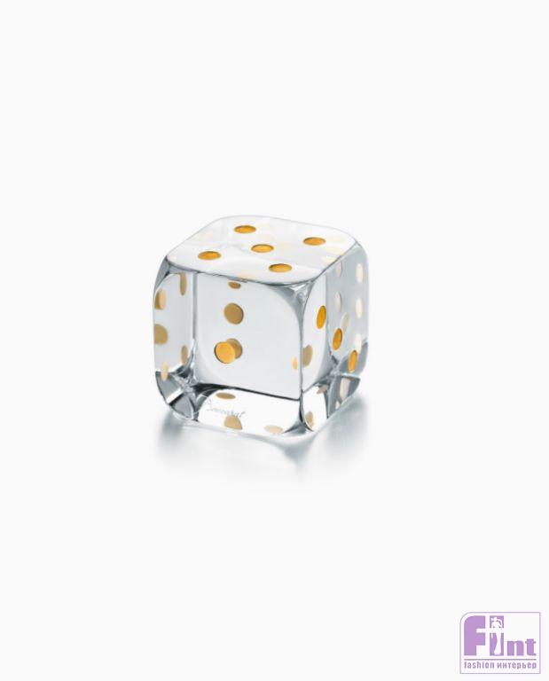 Игральные кости для Baccarat выполнены из прозрачного хрусталя, на них выгравированы точки-отметки с золотой эмалью. В набор входит 5 кубиков: четыре прозрачных и один красный.
