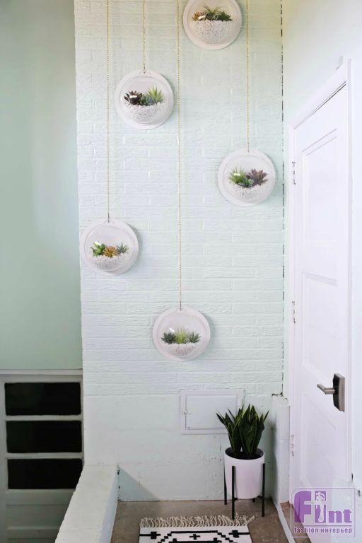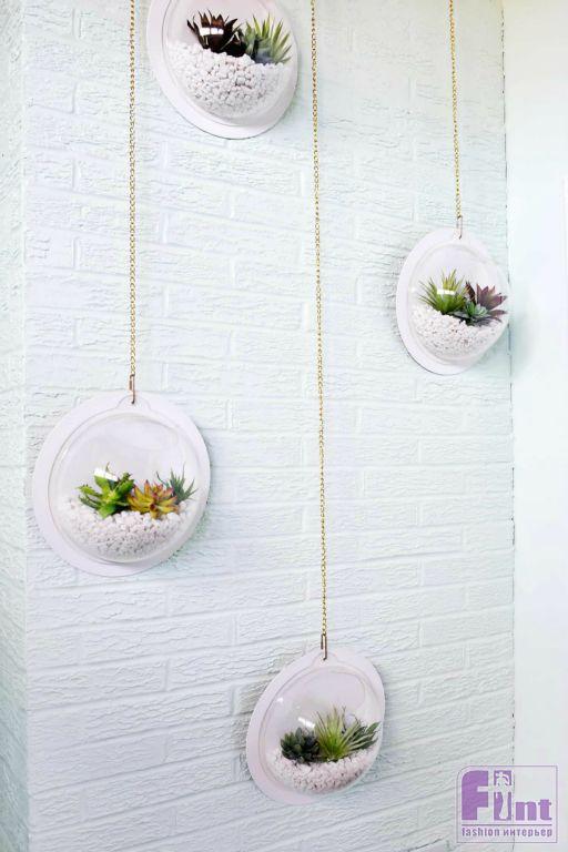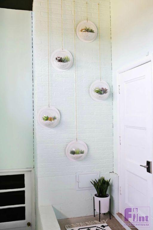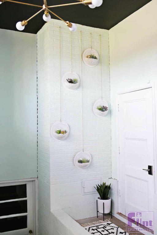 Осталось просверлить в стене отверстия и вкрутить в них шурупы с крючками на концах. На эти крючки мы и будем подвешивать наши настенные кашпо с красивыми суккулентами. Получилась настоящая фито-стена, которая украсит ваш дом, в каком бы стилевом решении он не был бы выполнен!
