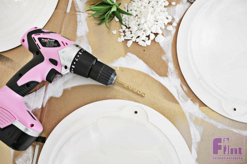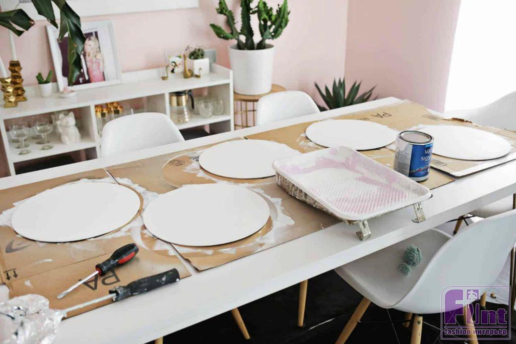 Сначала нужно покрасить деревянные круглые заготовки в белый цвет.На самом деле, вы можете поэкспериментировать с цветами, чтобы они подходили к вашему интерьеру, но мы решили, что зелёные растения будут отлично выделяться на белом фоне, да и стена у нас с имитацией белого кирпича, что также говорит в пользу выбора именно белой краски.
