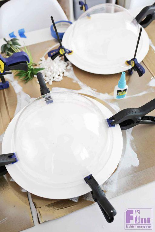 После того, как краска на наших круглых заготовках полностью высохнет, приклейте аквариумы к заготовкам, используя быстросохнущий клей. Чтобы надёжно приклеить аквариумы к деревянным основам, используйте небольшие столярные зажимы. Если у вас нет таких зажимов – не беда. Просто положите что-нибудь тяжёлое на аквариумы, придавив их к деревянным кругам. В этом случае важно не переборщить с весом, чтобы не расколоть пластик аквариумов.