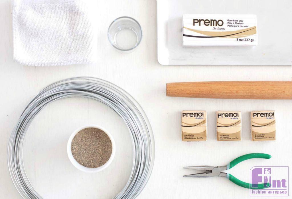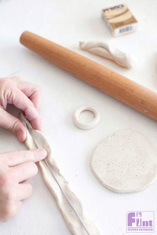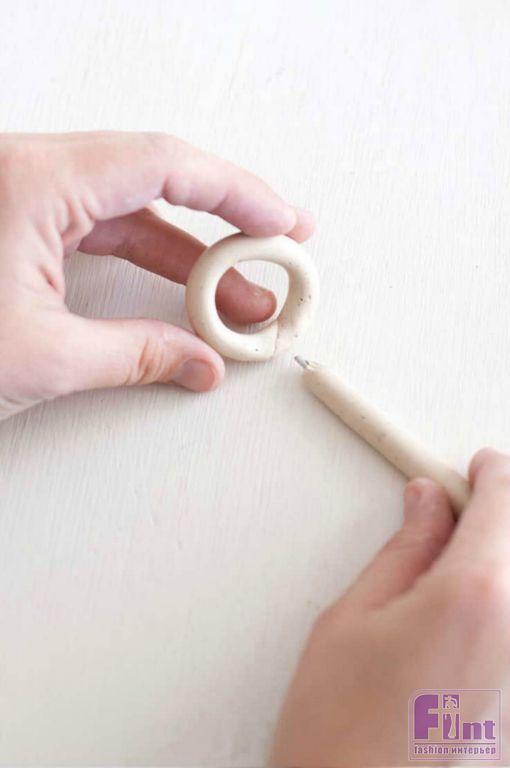 Шаг четвертый. Оберните немного глины вокруг куска проволоки, которую мы приготовили на первом шаге. Затем сверните глину и раскатайте, чтобы превратить её в «колбаску», внутри которой будет стержень из проволоки. Затем сделайте одно маленькое и одно большое кольцо той же толщины, что и наша «колбаска» с проволокой внутри. Толщина этих изделий должна быть примерно 15-17 мм. Диаметр малого кольца может быть небольшим – около 5 см. А диаметр большого кольца должен быть чуть больше, чем диаметр основания вашего стеклянного стакана. Теперь нужно аккуратно присоединить кольца к нашей прямой части, аккуратно пригладив места стыковки. Чтобы изделие было крепким, можно использовать дополнительные кусочки проволоки в качестве внутренней арматуры в местах стыковки колец и «колбаски».