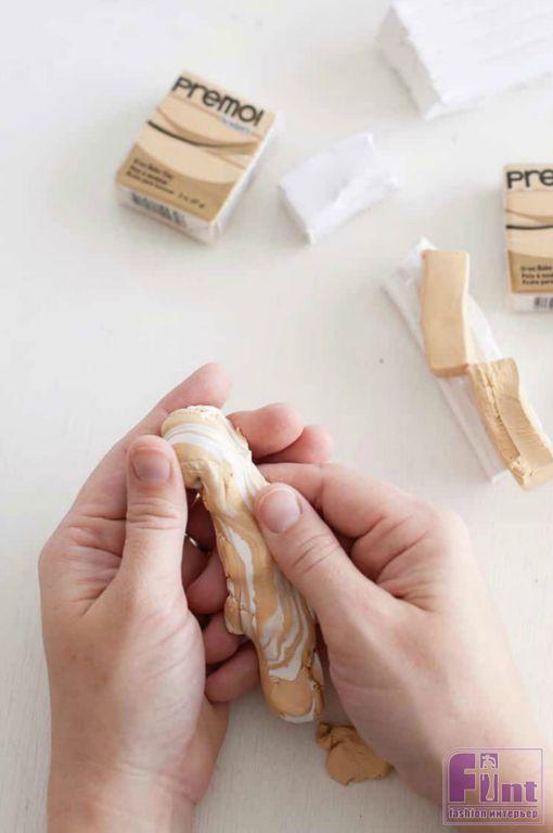 Шаг второй. Смешайте все три цвета полимерной глины и тщательно раскатайте. Мы использовали, в основном, белую глину, примешав к ней немного кремового цвета и цвета «серый гранит». Полимерная глина цвета «серый гранит» имеет в своём составе особые тёмные вкрапления, которая сделает нашу вазу похожей на изделие из необожженной керамики. В работе мы использовали полимерную глину марки Premo. Эта глина предназначена для того, чтобы быть достаточно твёрдой и удерживать форму итогового изделия. Но она может быть немного жесткой, когда вы начинаете работать с ней. Не волнуйтесь, потому что глина быстро размягчается от тепла ваших рук. Чтобы смешать цвета, просто продолжайте разбивать и скручивать глину, пока цвета не будут полностью смешаны в один тон.