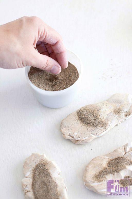 Шаг третий. Посыпьте немного крупного речного песка на глину и продолжайте работать с ней, чтобы песок равномерно распределился в объёме глины. Используйте столько песка, сколько вы хотите, чтобы придать глине более естественную текстуру и внешний вид. Этот шаг необязателен, но он позволил нам придать вазе действительно тот вид, который мы задумывали.