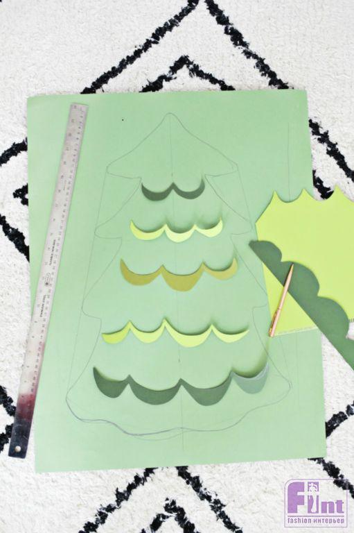 Нарисовать ёлочку можно довольно легко, поскольку в нашем проекте допускается любая условная форма новогодней ёлки – вплоть до обычного треугольника. Мы изобразили нечто похожее на ёлку, нарисовав еловые «лапы». Чтобы придать нашей плоской ёлочке «объёма», мы вырезали из цветной бумаги «волны», имитирующие тень от еловых лап на передней поверхности ёлочки. Эти цветные волнистые полоски мы приклеили к ёлочке при помощи двустороннего скотча.