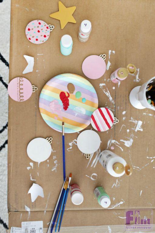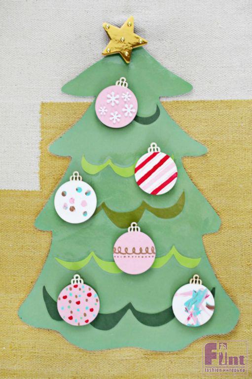Теперь настало время для украшений! Мы использовали заготовки ёлочных шаров и звёзд, которые изготовлены из очень тонкой фанеры. Такие заготовки почти всегда можно найти в магазинах для творчества и рукоделия. Если же вы не планируете посещать магазин из-за нашего мастер-класса, заготовки ёлочных шаров и звезды на макушку дерева вы можете сделать из того же плотного картона, который использовали в качестве основы для ёлочки.
