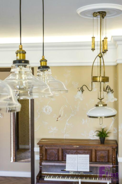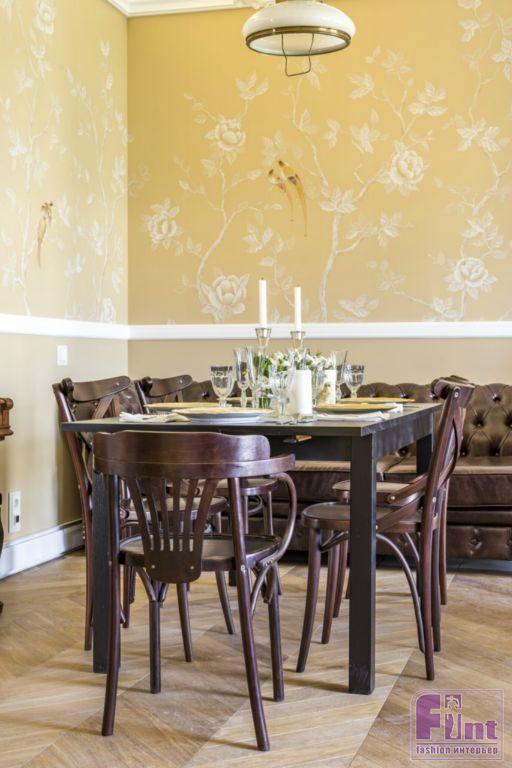 В проекте много лепнины. Изюминкой гостиной стали стены, расписанные вручную. Раньше такие стены можно было увидеть только во дворцах. Делает эту роспись российская компания, основанная семьёй художников. Мастера непосредственно выезжают на объект, чтобы лично прорисовать детали на стенах, с учётом освещения. На таких расписанных стенах обязательно ставится именная подпись автора.