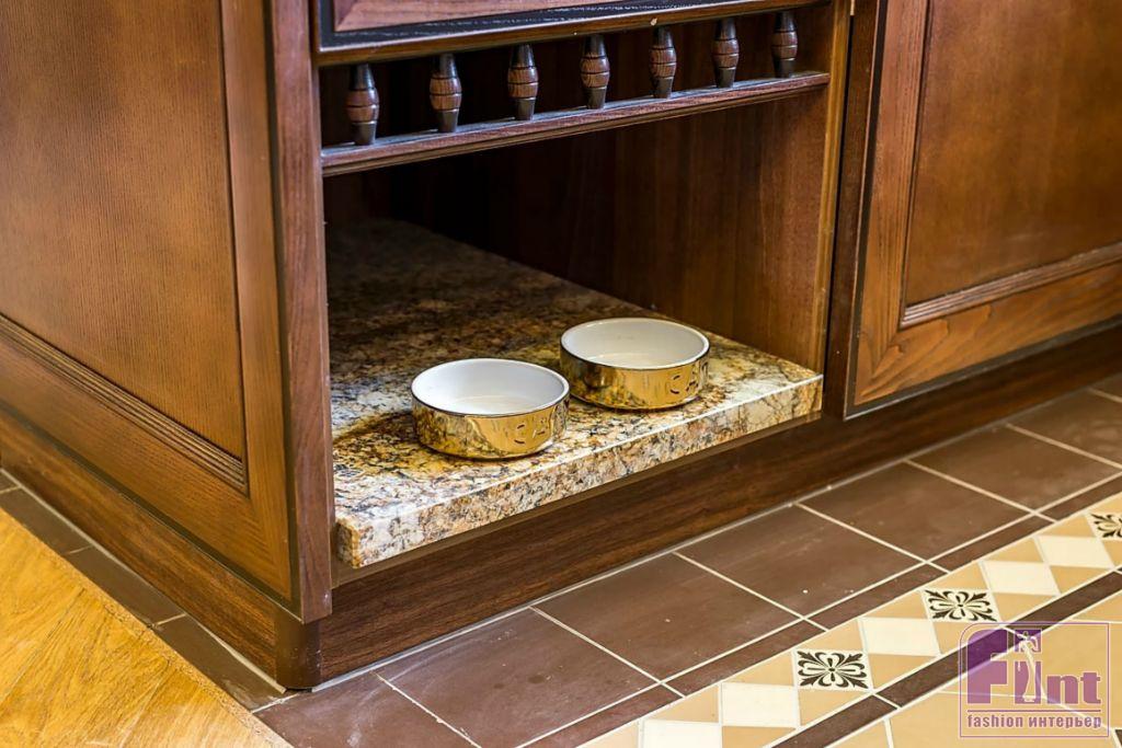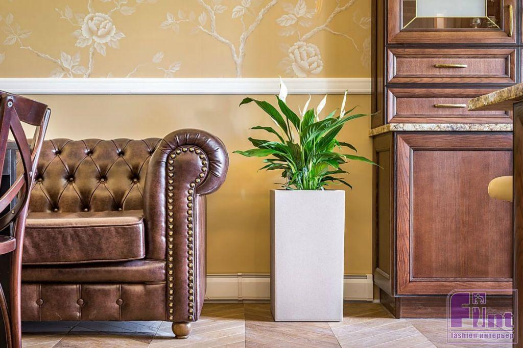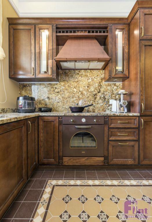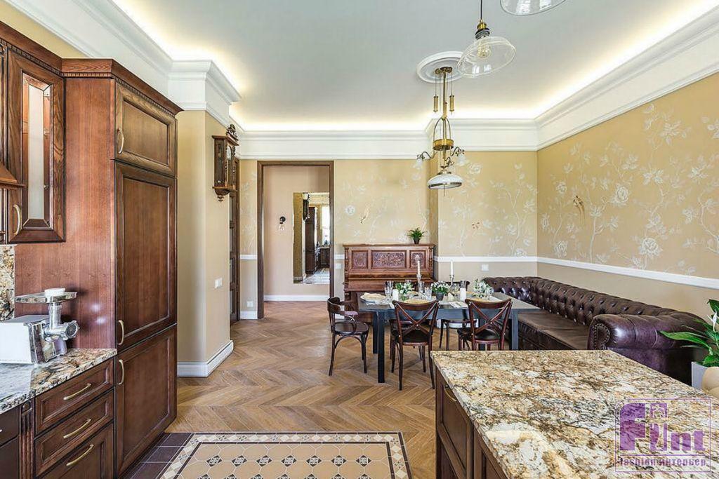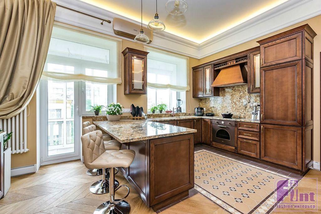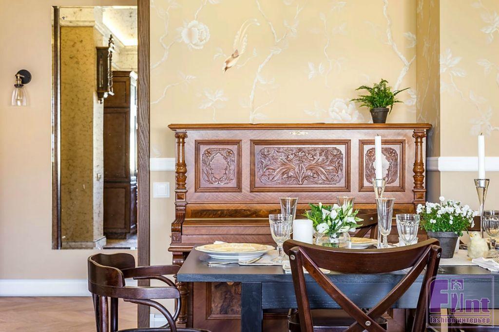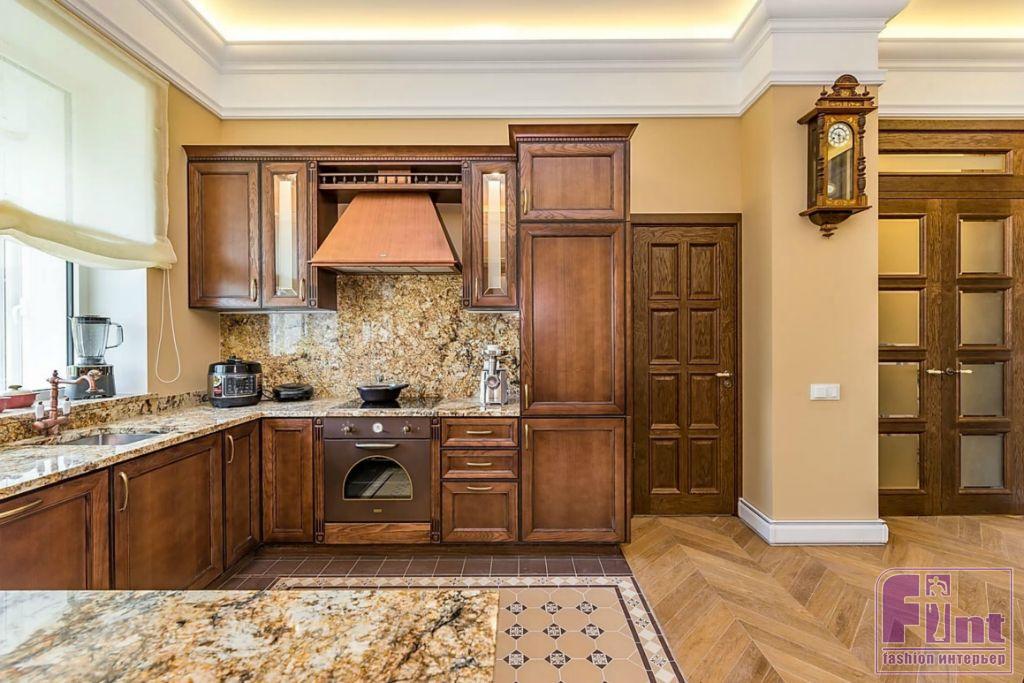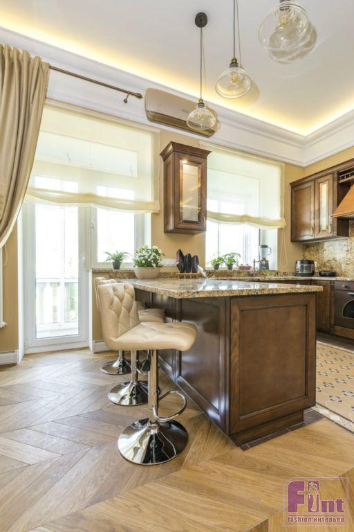 Для кухни авторы проекта выбрали белорусскую мебель из массива черешни. Её поверхность обработана, и любые царапины будут легко удаляться. Такая кухня, по словам производителя, прослужит более 35 лет. Для текстильного оформления выбрали шторы оттенка крем-брюле, тюль из тонкого батиста. В гостиной установлены новые двери из массива дуба, выполненного в очень красивом цвете «коньяк».