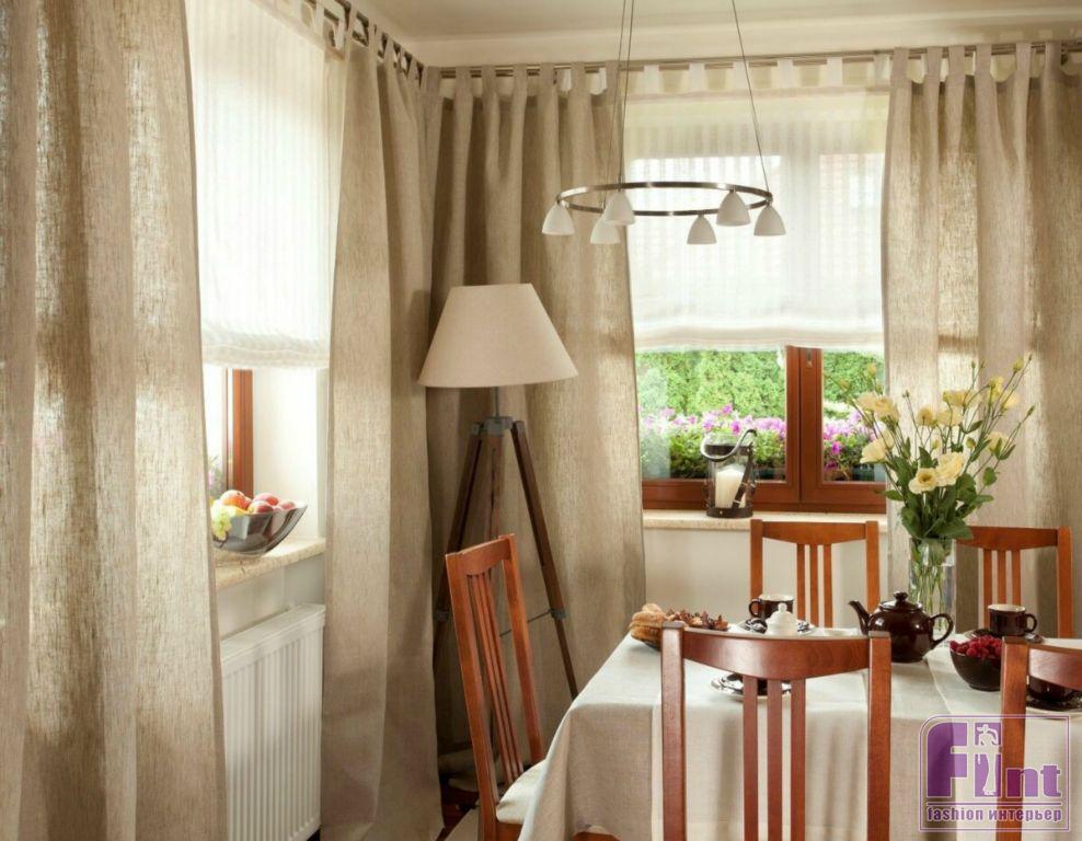 Пожалуй, лучший вариант декора кухонных окон – это занавески из льняной ткани. Устойчивый к влаге и выцветанию, лён еще и очень прочный материал: льняная ткань может служить вам десятилетиями. Кроме того, занавески изо льна легко стирать, хотя гладить такие шторы приходится на максимальной мощности утюга, помогая себе эффектом отпаривания. Современные дизайнеры предлагают льняные шторы не только в натуральном, соломенном оттенке, но и в самых различных цветах, самыми популярными из которых считаются деликатные пастельные оттенки зелёного, голубого и розового.