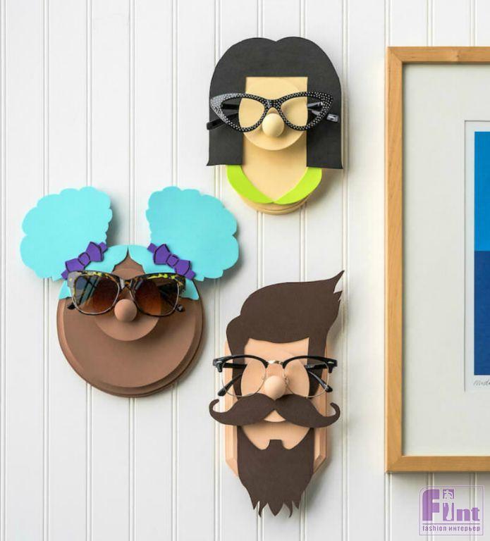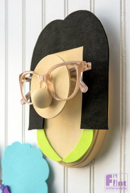 У каждого, кто носит очки, наверняка хранится в доме несколько пар этого модного аксессуара. Обычно очки свалены в ящиках комодов и шкафов, или пылятся на полках. Но можно хранить очки не только привычным способом, а сделать своими руками забавный настенный держатель для очков, который станет не только полезным аксессуаром, но и стильным украшением ваших стен. Тем более, что сделать его не составит особого труда, да и затраты на его изготовление будут весьма невелики. Кроме этого, вы можете видоизменить внешность наших забавных лиц по своему усмотрению: изменить цвет «кожи», «волос», «одежды» и других компонентов, которые формируют смешные лица на держателях.