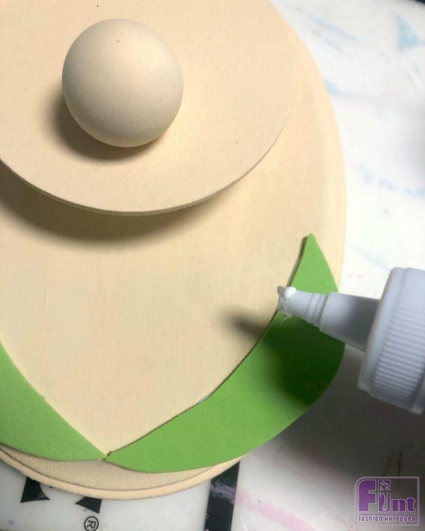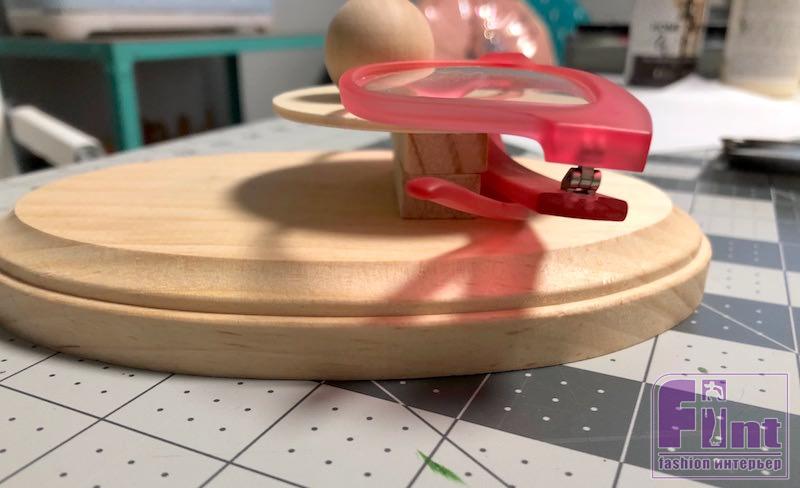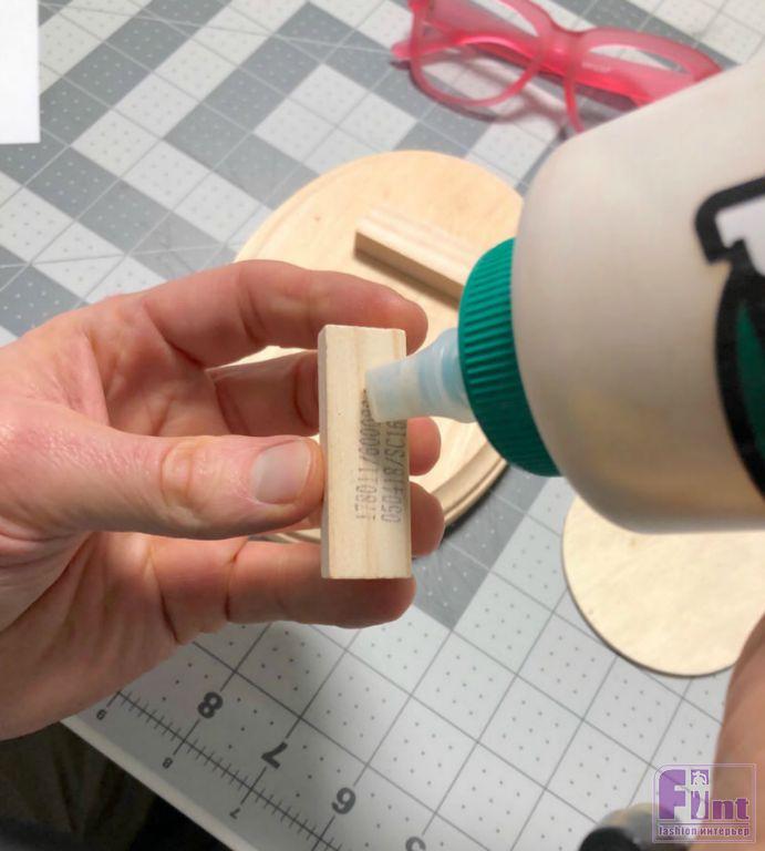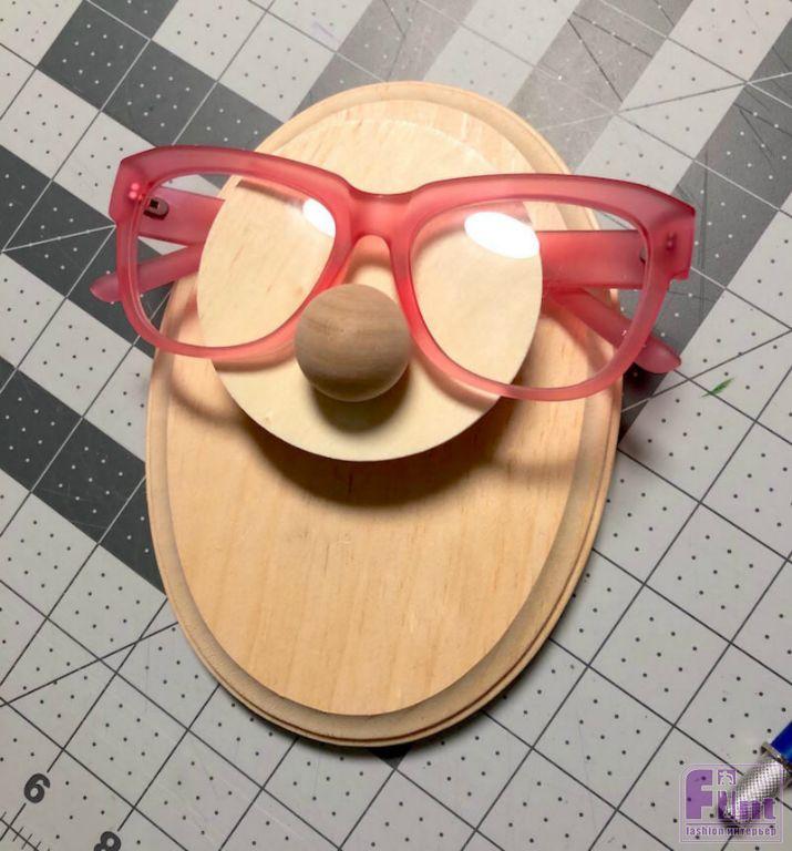 Приклейте фанерный кружок поверх деревянных частей, в центре. Затем приклейте круглую деревянную ручку чуть ниже центра. Это будет нос нашего лица, поэтому располагайте его примерно там, где и расположен нос на обычном лице. На этом этапе важно проверить, чтобы носовая часть очков находилась на круглой деревянной ручке, а дужки очков идеально лежали на брусочках позади кружочка из фанеры. Дайте клею полностью высохнуть.
