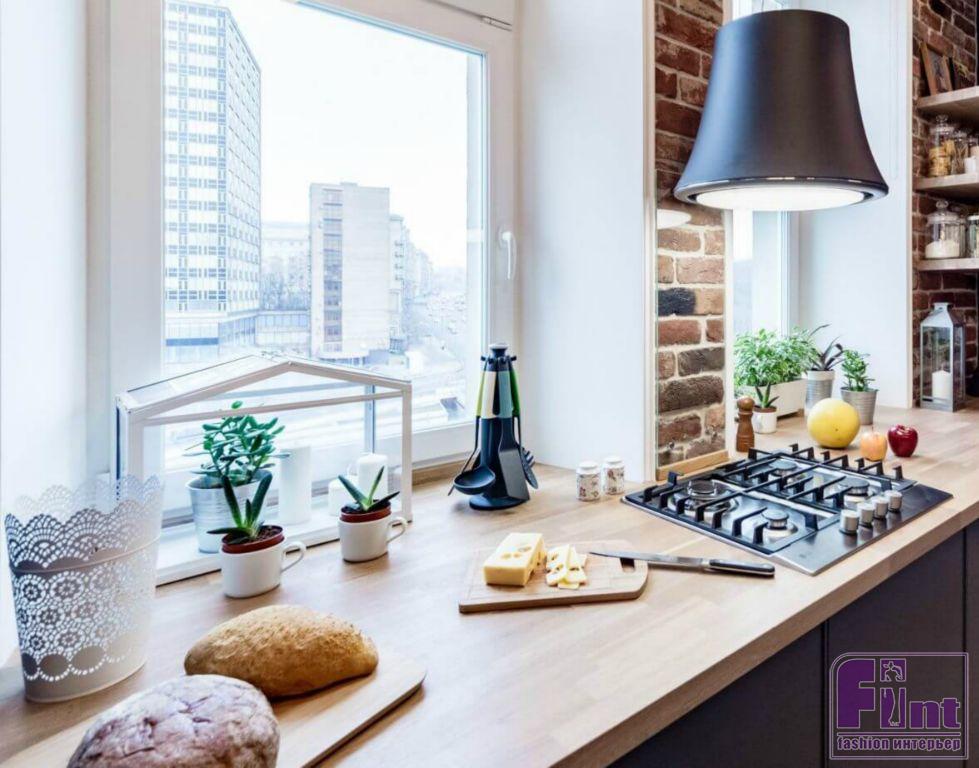 Оригинальное решение для небольшой кухни — использовать подоконник, как рабочую поверхность, просто немного расширив его вглубь комнаты. Можно также перенести раковину от стены к окну, и на кухне освободится место для просторного обеденного стола. Правда, оконное стекло придётся регулярно мыть из-за мыльных брызг от посуды.