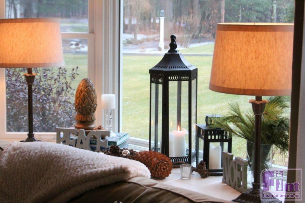 Если вы не в самых тёплых отношениях с комнатными растениями, подоконник можно украсить декоративными безделушками, в том числе новогодней тематики. Особенно выразительно в этом случае будет выглядеть окно без штор или с лёгким тюлем. На подоконниках идеально смотрятся различные декоративные фонарики, свечи и другие источники света.