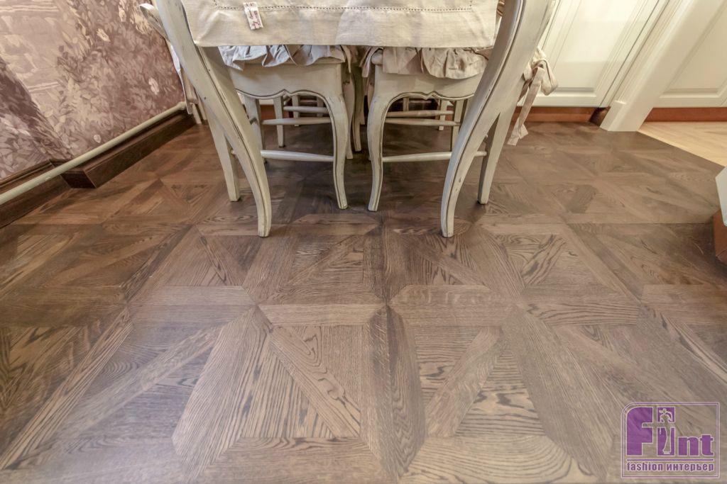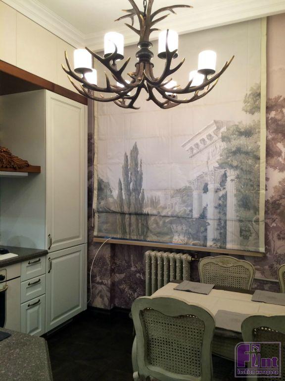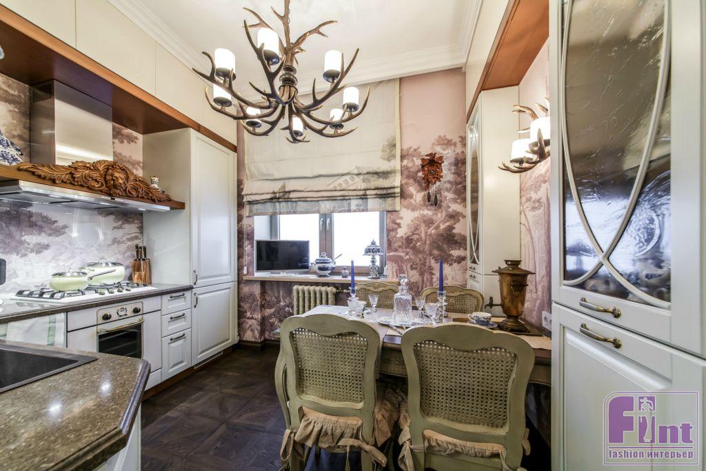 Светильники сделаны достаточно оригинально с использованием оленьих рогов. На полу выложен добротный и долговечный дубовый паркет. Деревянную тему интерьера продолжает массивная резная панель, размещённая на кухонной вытяжке. Встроенная бытовая техника выдержана в стиле ретро. Римские шторы повторяют орнамент расписанных вручную стен.