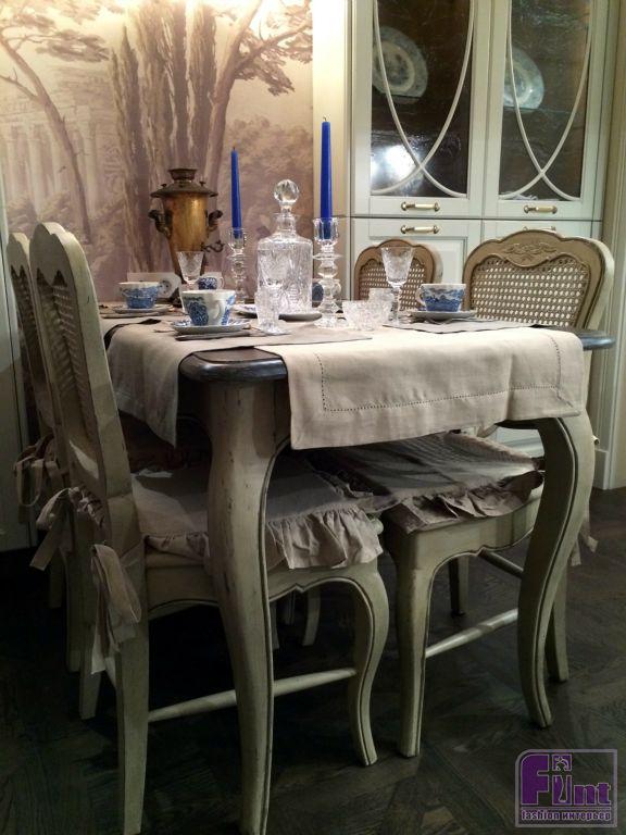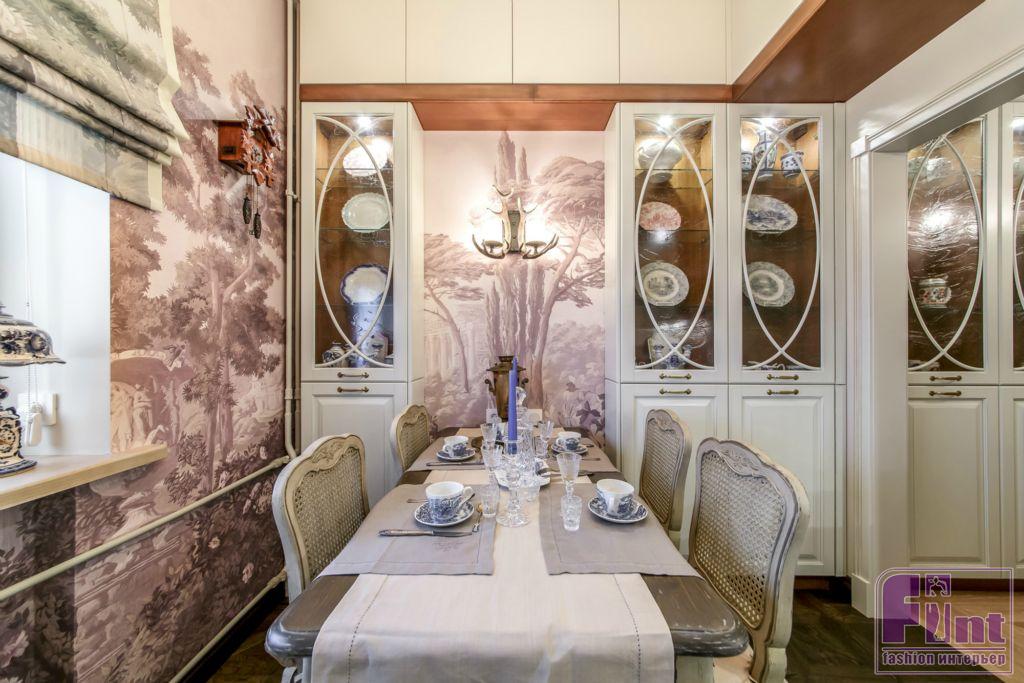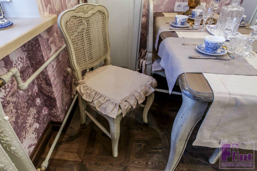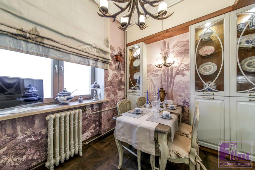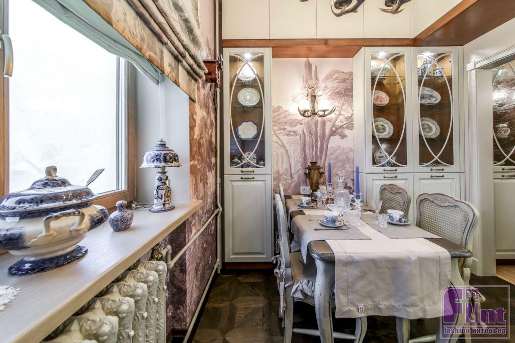 Для того чтобы кухня стала похожа на уютный охотничий домик, дизайнер предложила использовать сложную цветовую гамму с сочетанием серых, белых и розовых оттенков. Анна постаралась органично вписать в новый интерьер всю коллекцию антиквариата Немоляевой. Нашли своё место и посуда родом из Гжели, и расписные подносы, и старинный самовар. Кухонные шкафчики из светлого дерева заменили шкафами светло-серого цвета со стеклянными дверцами. Появился обеденный стол с гнутыми ножками и стулья с решётчатыми спинками. Весь гарнитур выдержан в серых тонах, а его поверхность специально состарена.