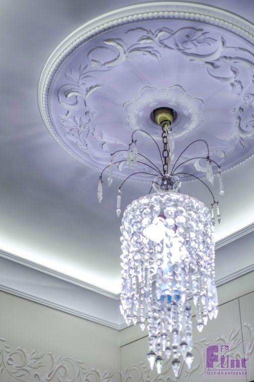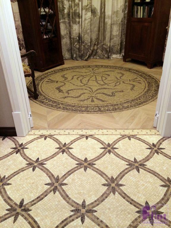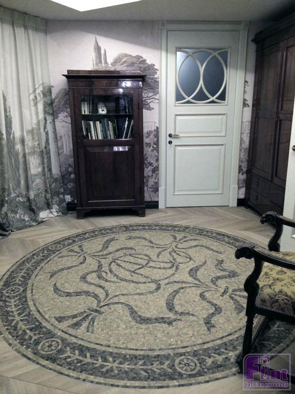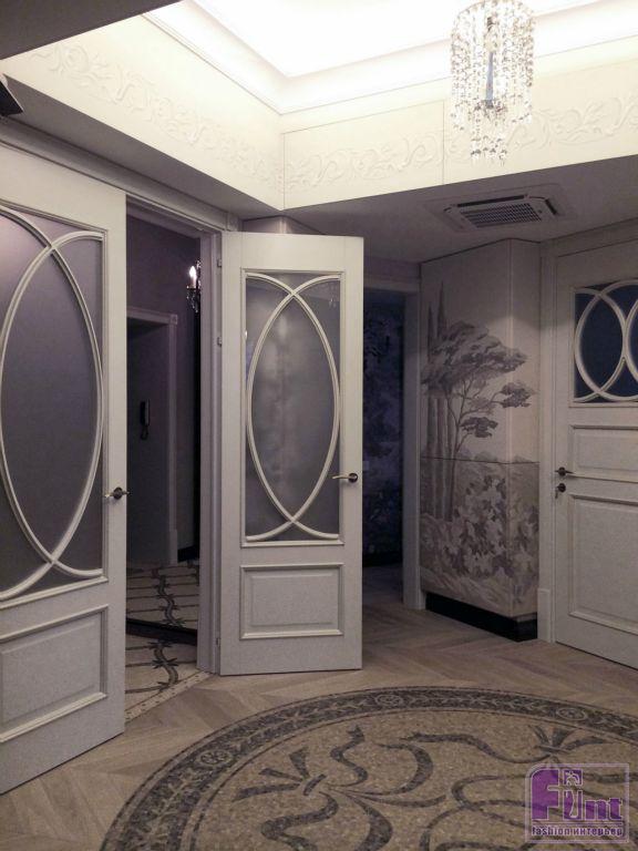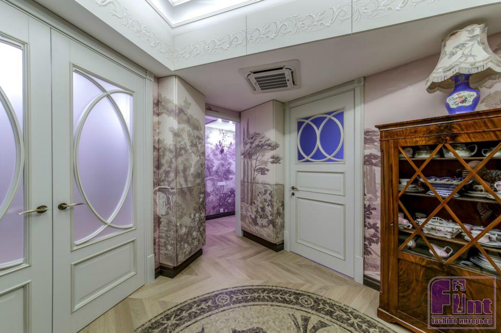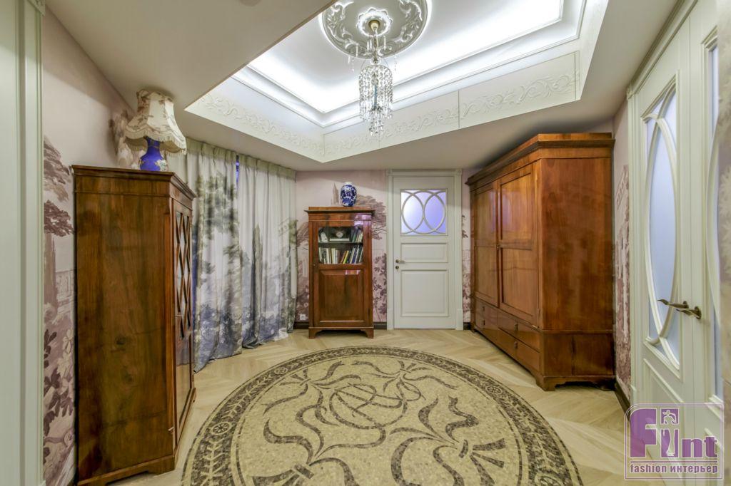 В холле дизайнер добавила к росписи на стенах светлые двери, которые отлично сочетаются с цветовой гаммой фресок. Большой шкаф-купе со стеклянными дверцами прекрасно вписался в пространство и отлично дополняется паркетом, выложенным орнаментом французской ёлочки. Эпицентром дизайна этой гостевой зоны стала большая круглая мозаика с инициалами Народной артистки по центру. Гармонично дополняют интерьер два больших антикварных буфета, изготовленных из красного дерева.