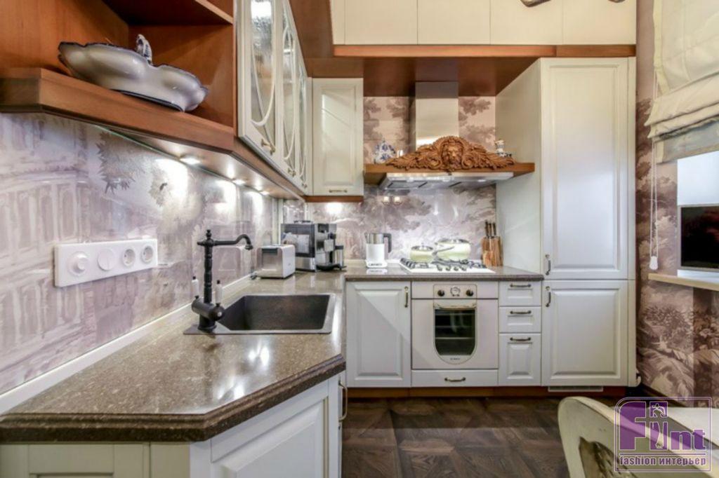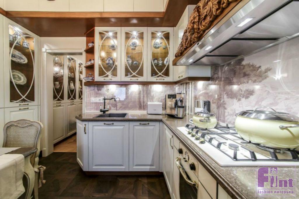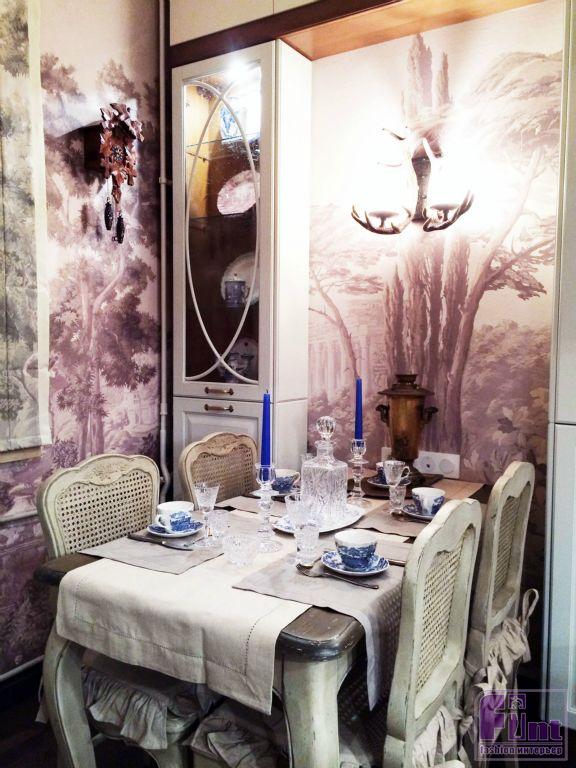 Холл, который в процессе переделки объединили с кухней, стал похожим на шикарный парк XVIII века. Очень необычную тему дворцового сада поддерживает роспись стен: выполненные вручную фрески по штукатурке на мотивы французской пейзажной живописи стали настоящей изюминкой и визитной карточкой этого интерьера. Ну а в «глубине парка» расположился уютный и светлый «охотничий домик», в который превратилась кухня Народной артистки.