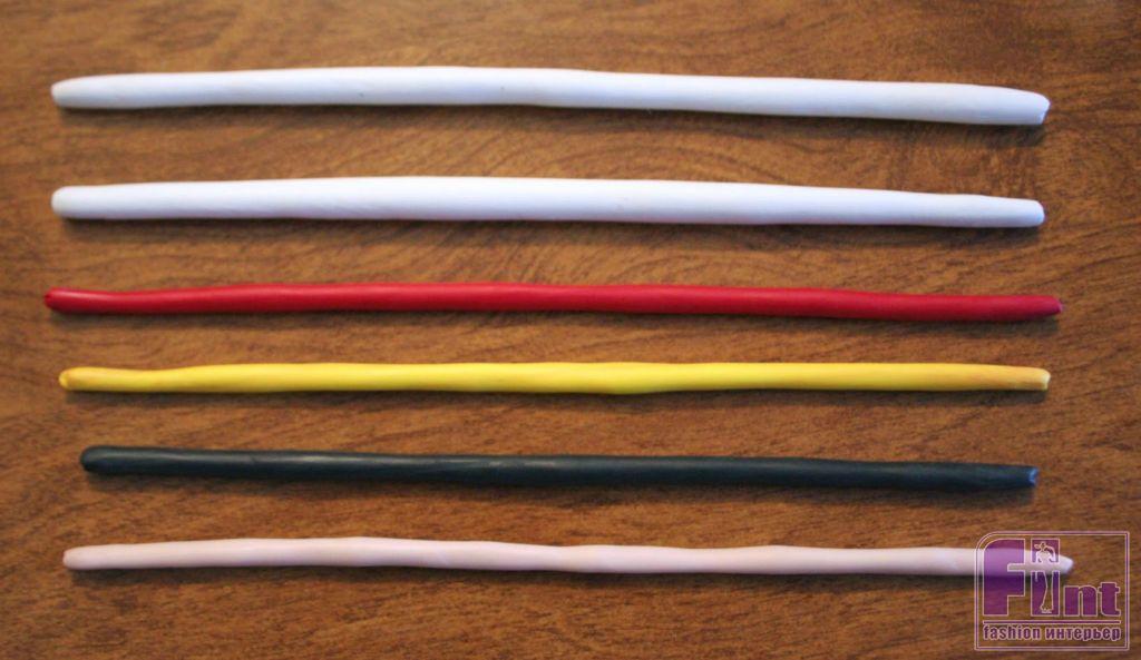 Выберите цвета полимерной глины, которые вы хотели бы использовать для вашей тарелки, и раскатать их в тонкие «колбаски» длиной примерно 12 – 15 см. Для наших тарелок мы использовали две толстые белые «колбаски», одну маленькую чёрного цвета, к которым добавляли «колбаски» трёх других выбранных цветов, красиво сочетающихся между собой.