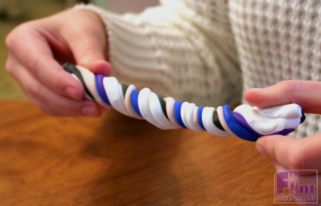 Скрутите получившиеся заготовки вместе «косичкой». Сложите получившуюся скрутку пополам и снова скрутите в том же направлении. Продолжайте скручивать заготовку, пока цвета не смешаются в нужном вам виде. Чем сильнее вы будете скручивать «косички», тем мельче получится мраморный узор на готовых тарелках.